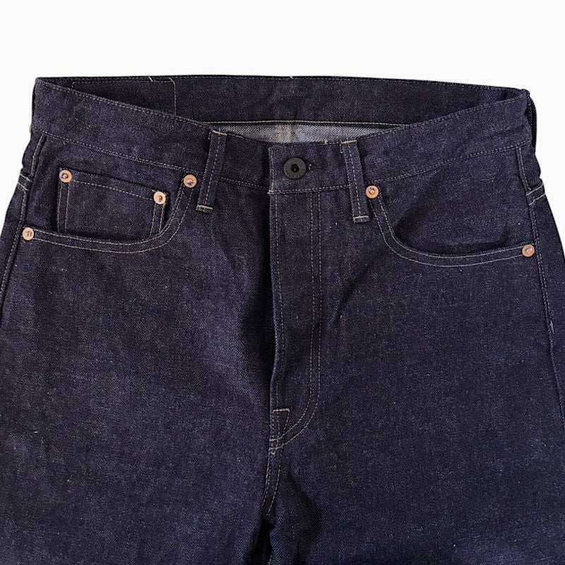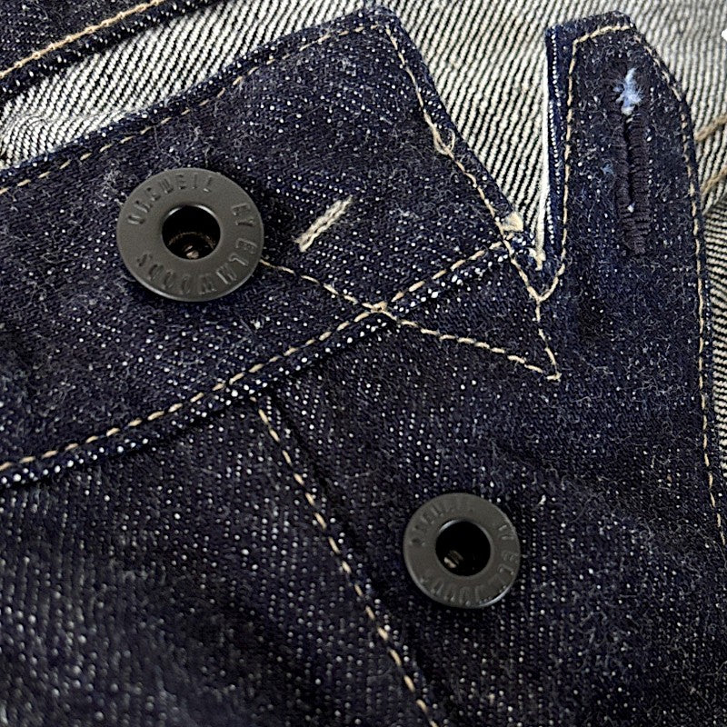 The denim is made of 14.0 oz. right-hand twill denim dyed with indigo rope dyeing.