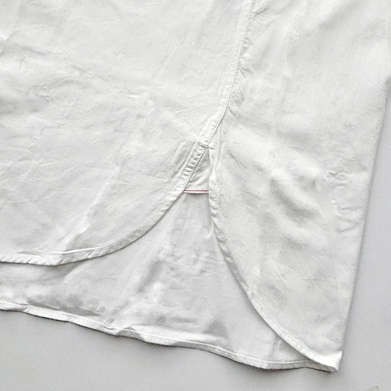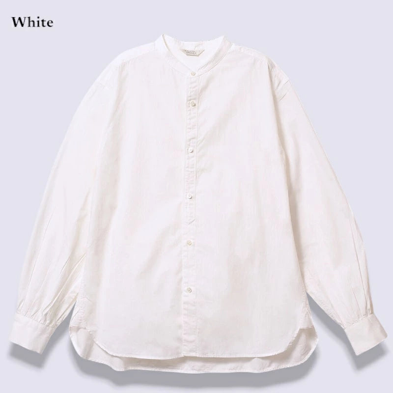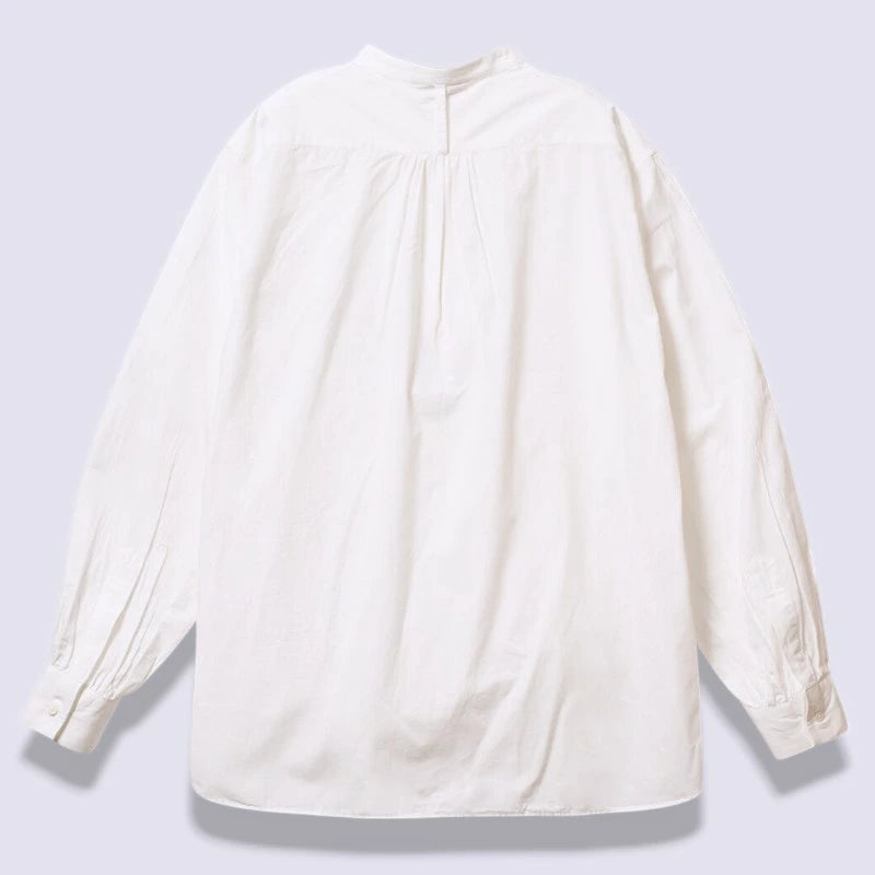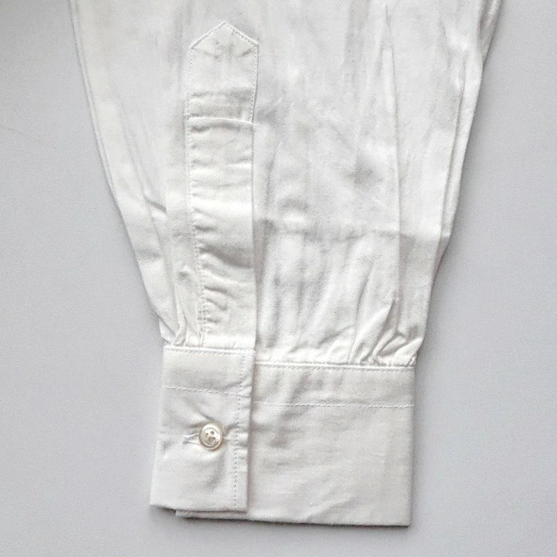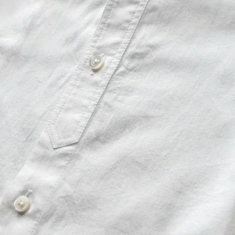 1900 年代初頭のブロードシャツを、オルゲイユ独自のフィルターを通して再構築しました。二重仕様のカフスが特徴で、ボタンが引っかからないように比翼のような役割を果たしています。日常で使いやすくするため、プルオーバー仕様から前開き仕様に変更しました。袖口や後ヨーク部分には細かなギャザーが入り、ワークシャツでありながら、ドレスシャツのような上品さも感じさせます。