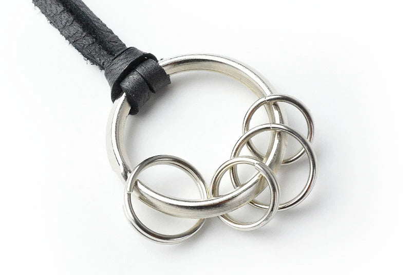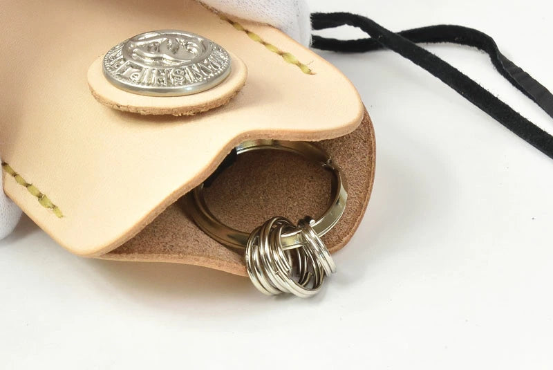 ベルの鐘のように内側にリングが付き、紐をほどくと鍵が底から飛び出すドロップ式のキーケース。