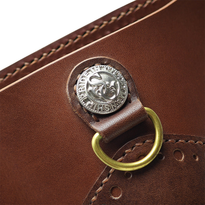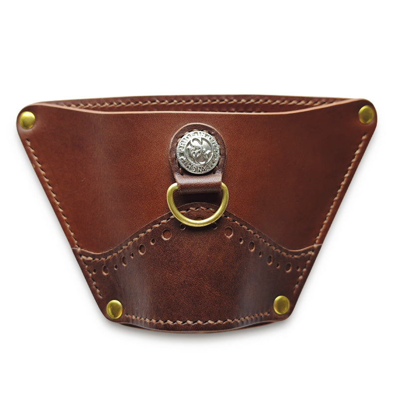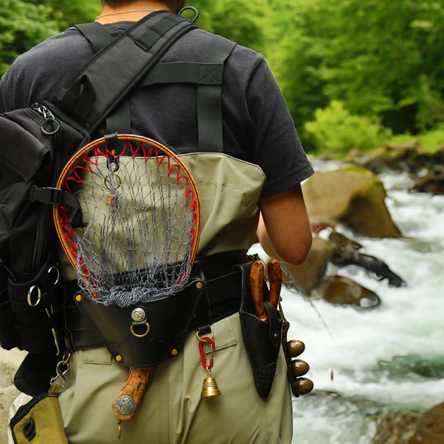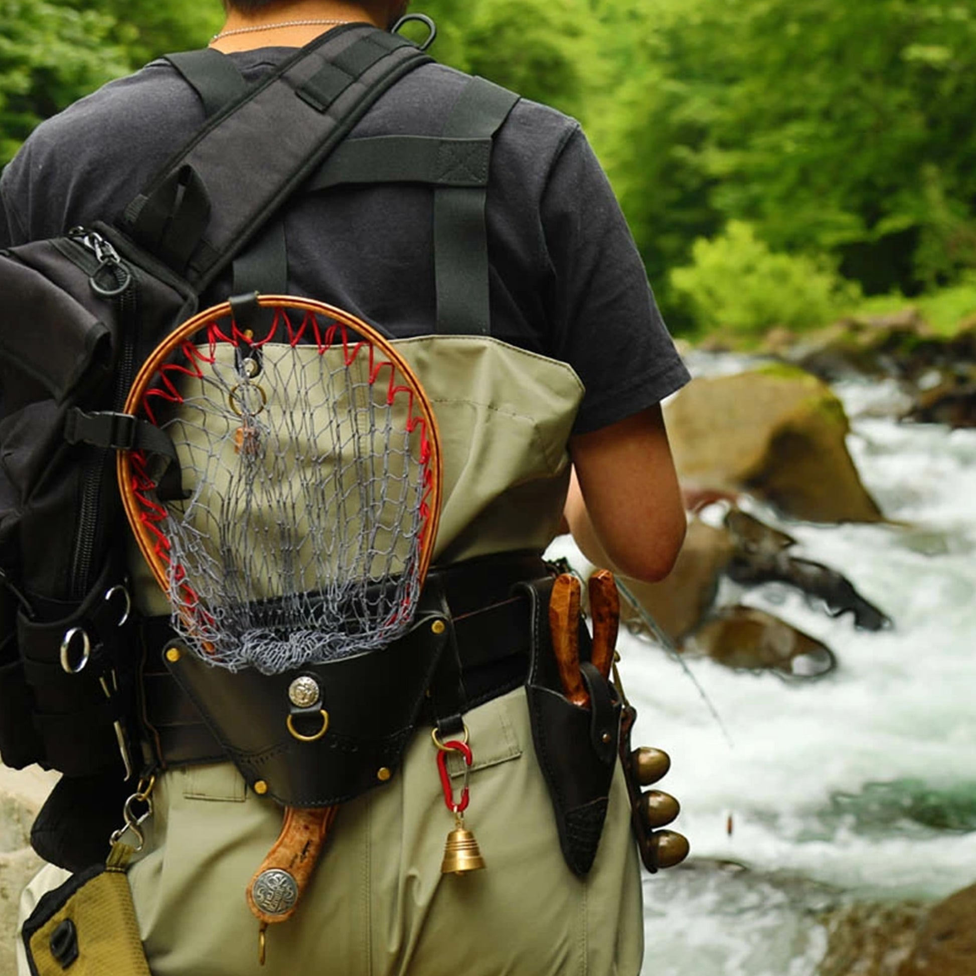 ランディングネット(釣り用の網)を収納するネットホルスター。ベルトに通して腰に装着するタイプ。厚みがあり型崩れのしないタフなボディ。メダリオンオーバーレイにより強度とデザイン性をプラスした。前面にDカンが付いているので、リーシュコードで繋いでおけば紛失防止にもなる。