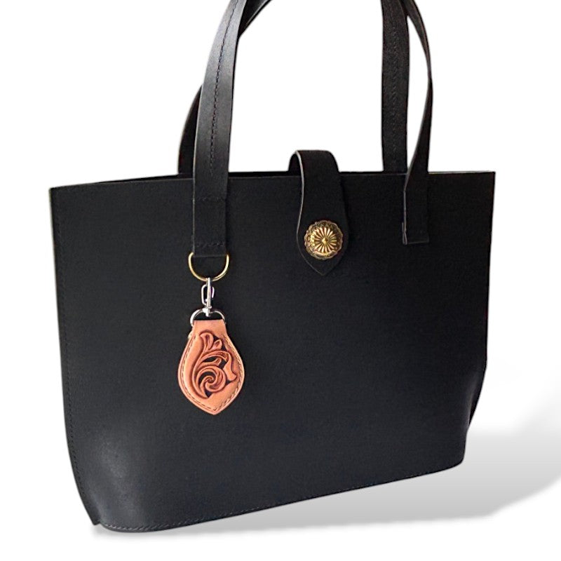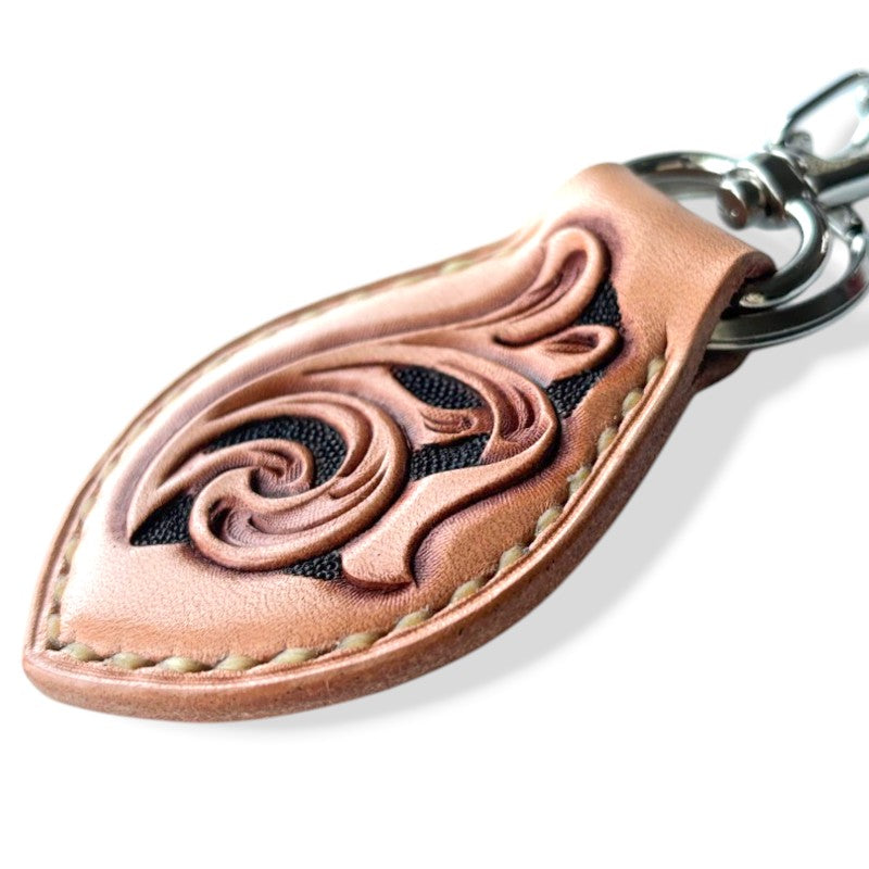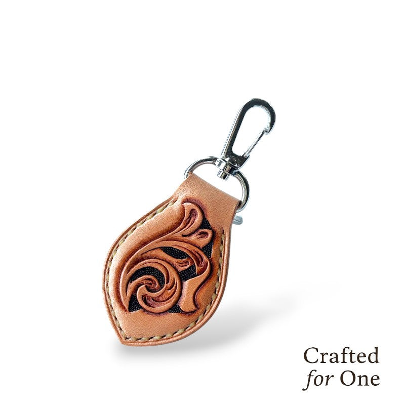 A one-of-a-kind leather keyring, "Tsutakizami", featuring hand-carved ivy vines that twist and grow across the surface.