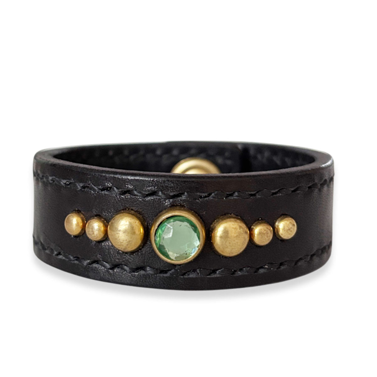 黒のレザーブレスレットに、中央のクリアアクリルスタッズと、左右に配された真鍮スタッズが静かに存在感を放つ一本。