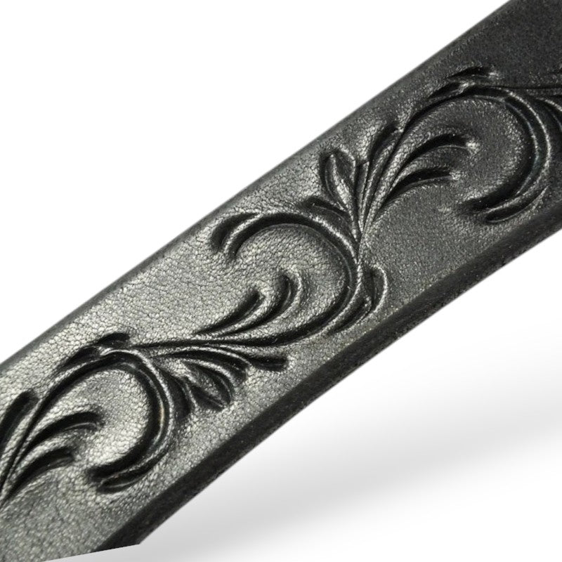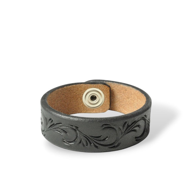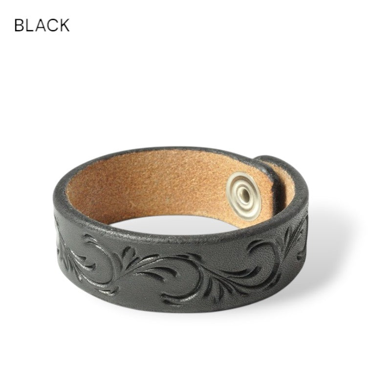 生命力を感じさせる、唐草模様のカットワークが印象的なレザーブレスレット。