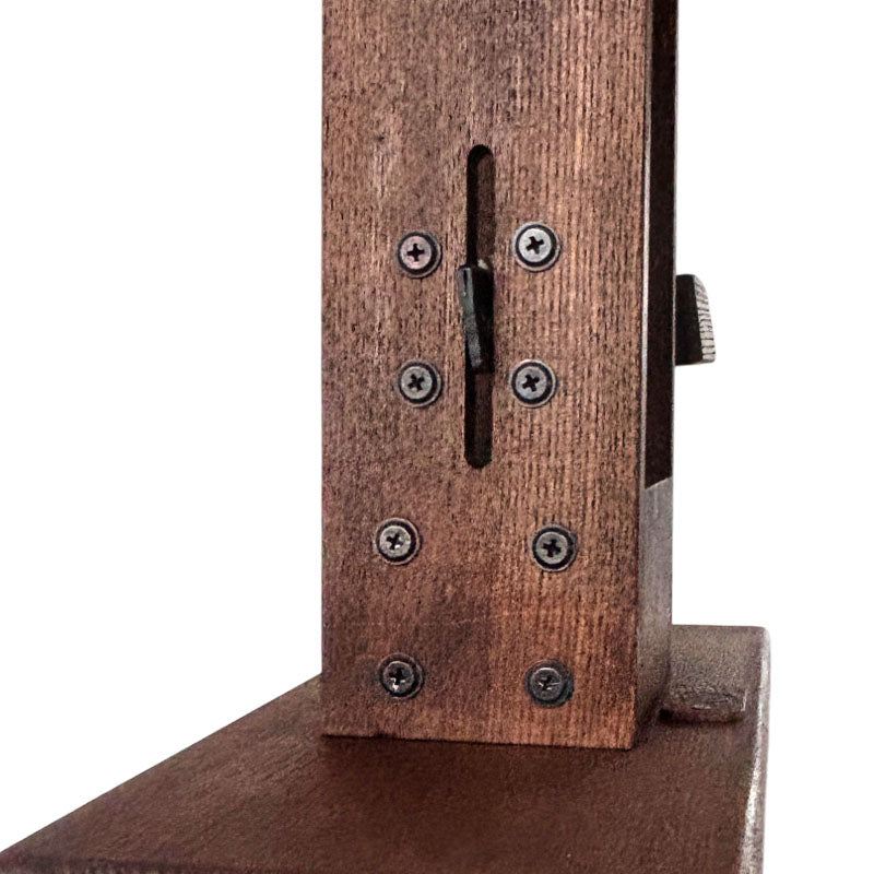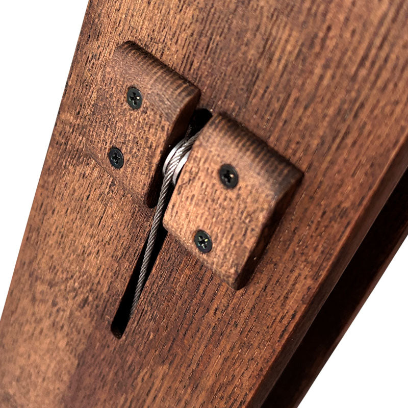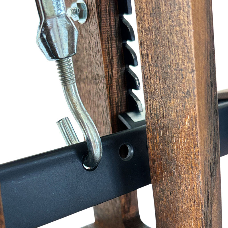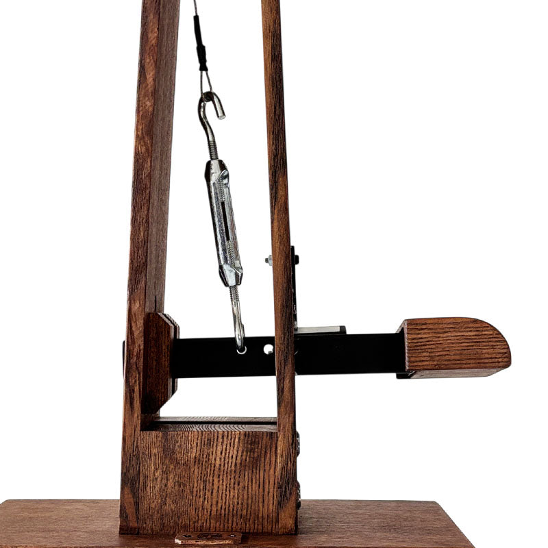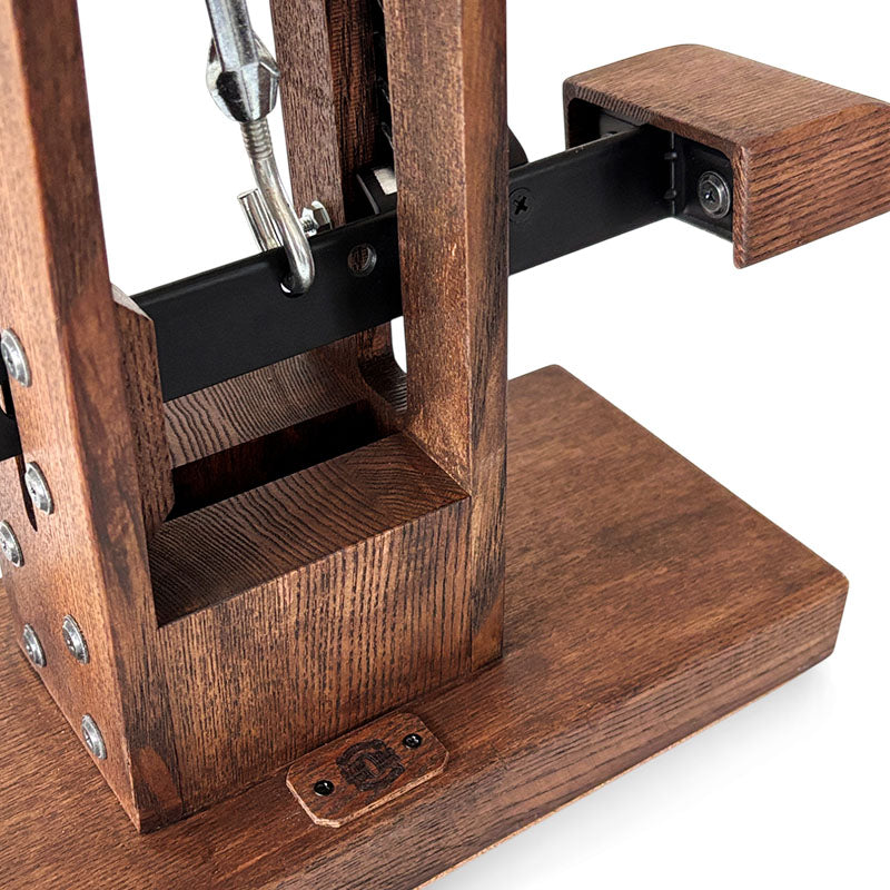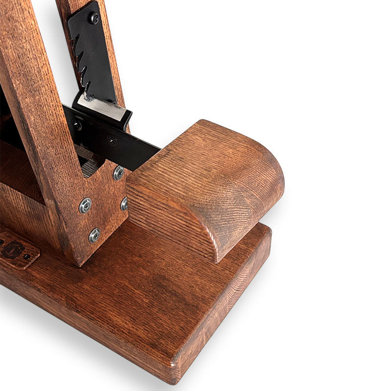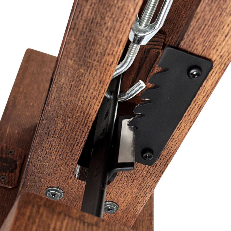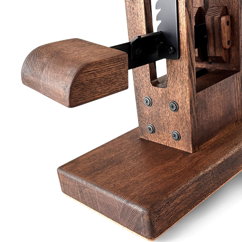 足踏み操作部分のタモ材ペダルは鉄製パーツで補強されており、38mmのビス2本で確実に固定。フレームは70mmのビス4本でしっかり組み上げられており、長期使用に耐えうる堅牢な作りです。