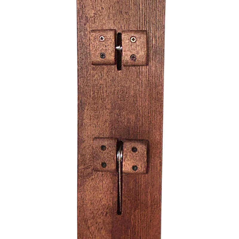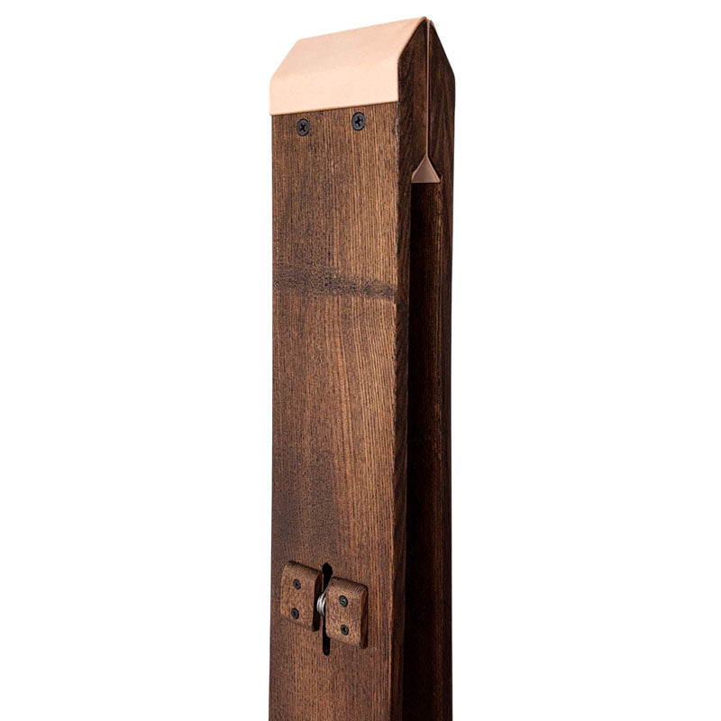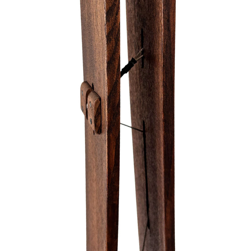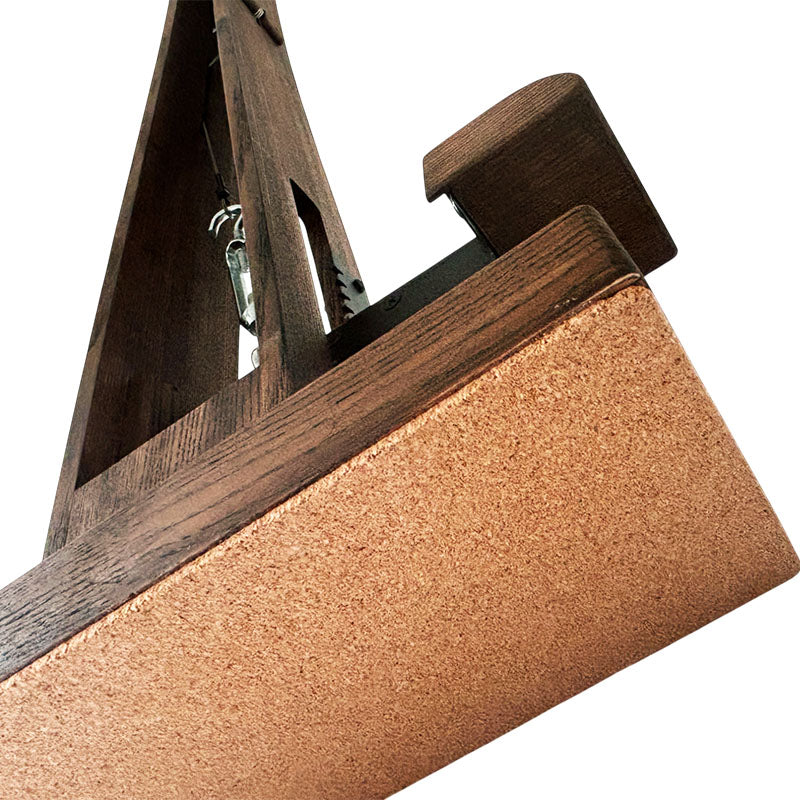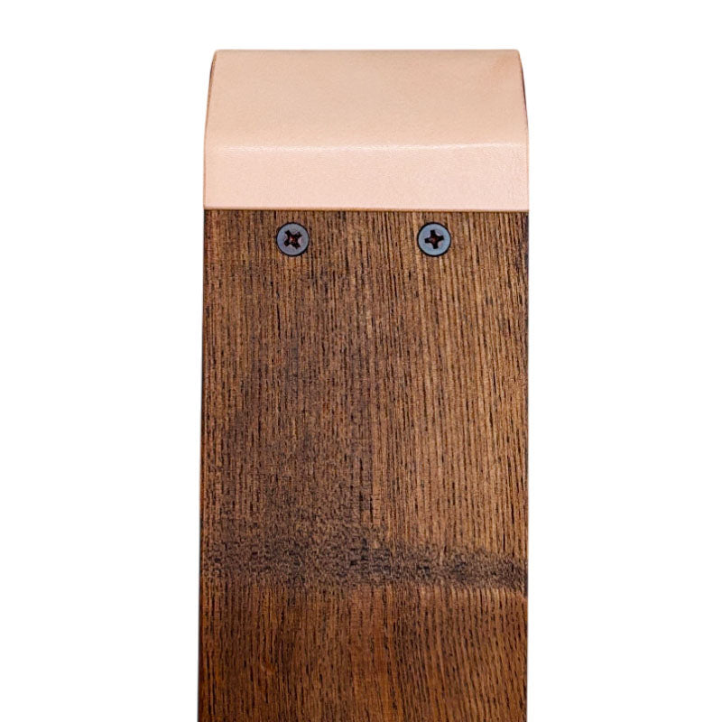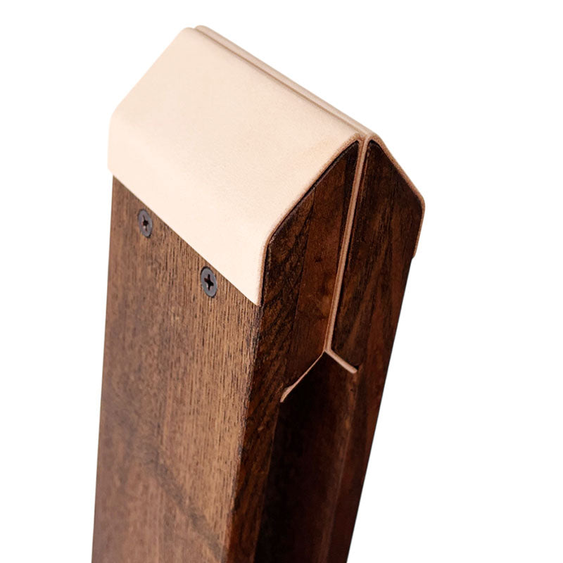 革を挟む長い部分は「ホールドバー」と呼ばれ、高級タモ材(無垢材)を使用しています。ここには1.5mm厚のヌメ革を両面テープで丁寧に貼り付けており、大切な作品を傷つけずしっかりホールドします。