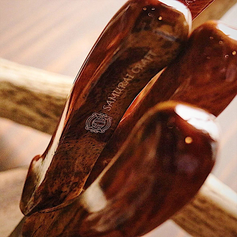 ハンドルには美しい杢目が特徴の花梨瘤(かりんこぶ)を使用し、表面はウレタン塗装で仕上げました。工具でありながら、手に取るたびに所有感を味わえる特別な存在。