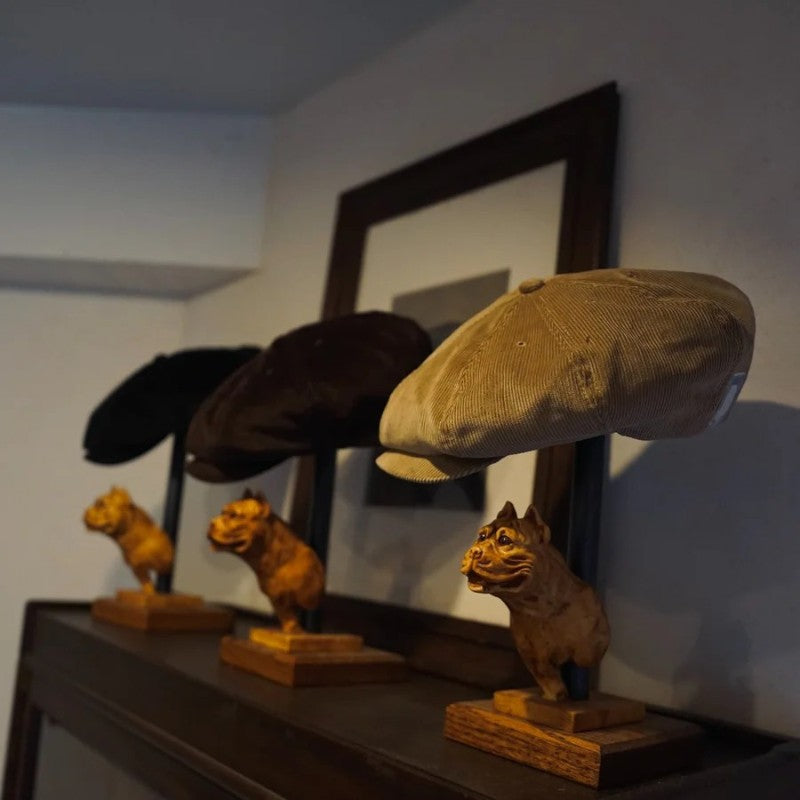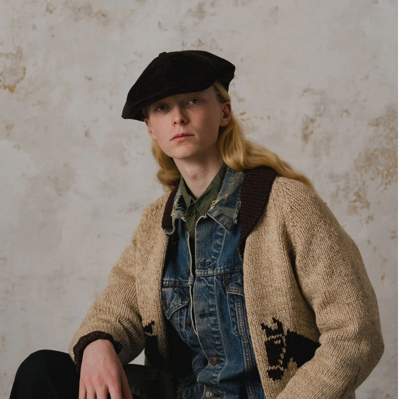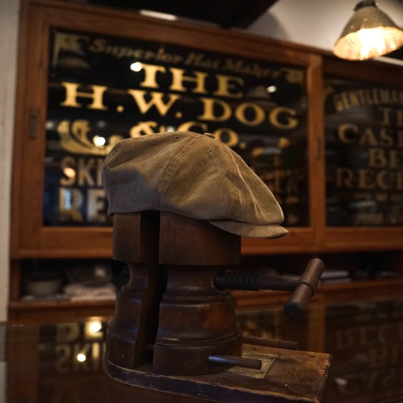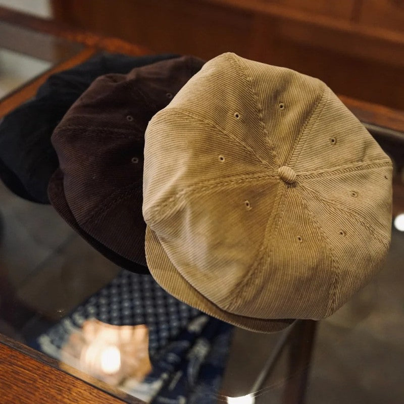 1930年代ファッション、アメリカンカジュアルの始まりの形で、クラウンが大きくボリュームのあるキャスケット型をフロントパネルを前へ倒し庇と結びつけたハンチングです。