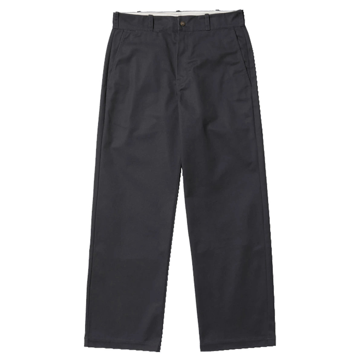 ポリエステル65%、コットン35%の混率で織り上げた頑丈なツイル生地を使用したワークトラウザース。生地は肌触りの良さに加えシワになりにくく、特有の光沢感が特徴。TUF-NUTのヴィンテージトラウザースは尿素ボタン仕様のものが多くみられるが、利便性を考慮してブランド名が刻印されたスナップボタンを採用している。ウエストのコインポケットやブラス製のTALONジッパーなど、ヴィンテージのディテールを取り入れつつも、現代の生活に合わせポケット口や袋布はやや大きめの設計。シルエットは太めのストレートで、全てのウエストサイズのレングスを統一している。