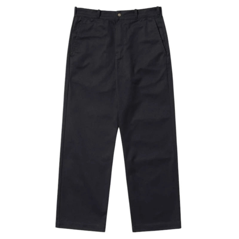 ポリエステル65%、コットン35%の混率で織り上げた頑丈なツイル生地を使用したワークトラウザース。生地は肌触りの良さに加えシワになりにくく、特有の光沢感が特徴。TUF-NUTのヴィンテージトラウザースは尿素ボタン仕様のものが多くみられるが、利便性を考慮してブランド名が刻印されたスナップボタンを採用している。ウエストのコインポケットやブラス製のTALONジッパーなど、ヴィンテージのディテールを取り入れつつも、現代の生活に合わせポケット口や袋布はやや大きめの設計。シルエットは太めのストレートで、全てのウエストサイズのレングスを統一している。