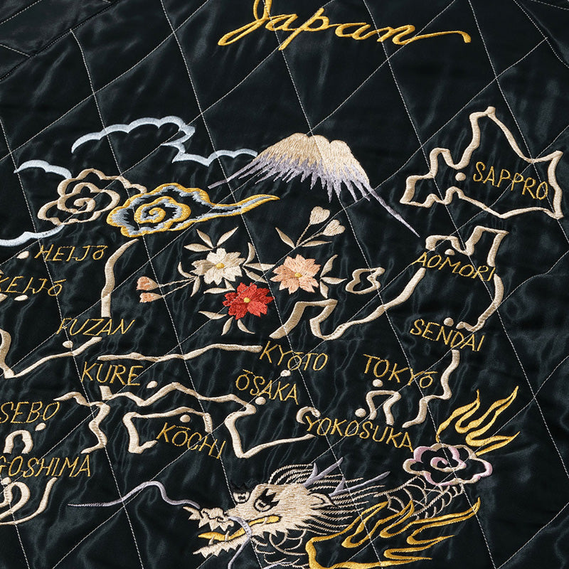 リバーシブル面はブラックの単色ボディに日本地図を描いたジャパンマップ柄。朝鮮半島も併せて描かれていることから1950年代中期の作品であることがわかる。富士山や龍などのモチーフも加え、赤い桜を背面の中心に配してアクセントとしており、その完璧なバランスに当時の職人のセンスが感じられる。