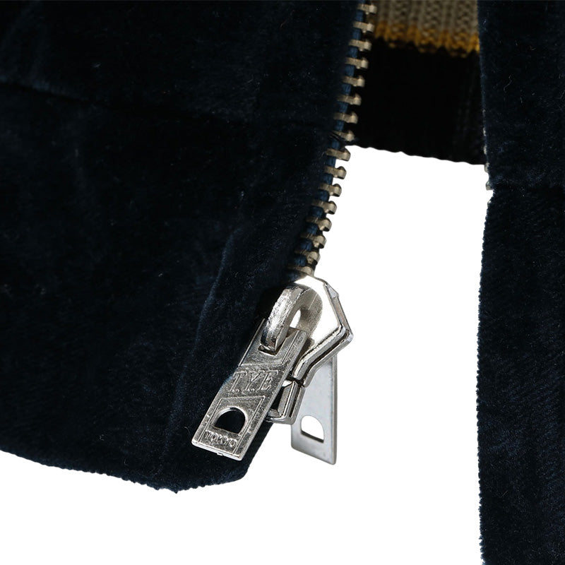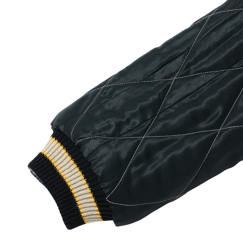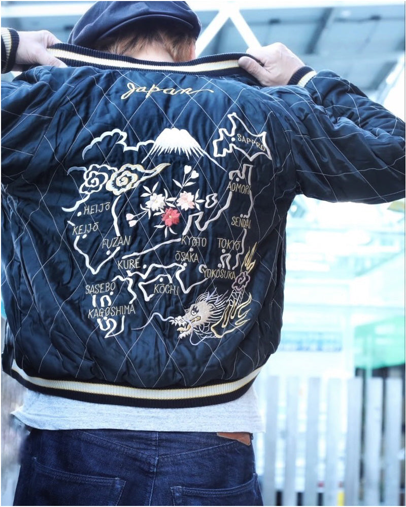 初期のスーベニアジャケットはアセテート生地のリバーシブル仕様が多いが、当時のバリエーションとして毛羽感のある別珍(べっちん)生地を使ったモデルも存在する。中綿を入れることで防寒性を高め、リバーシブル面のアセテートには中綿を押さえるためのキルティングが施されていた。