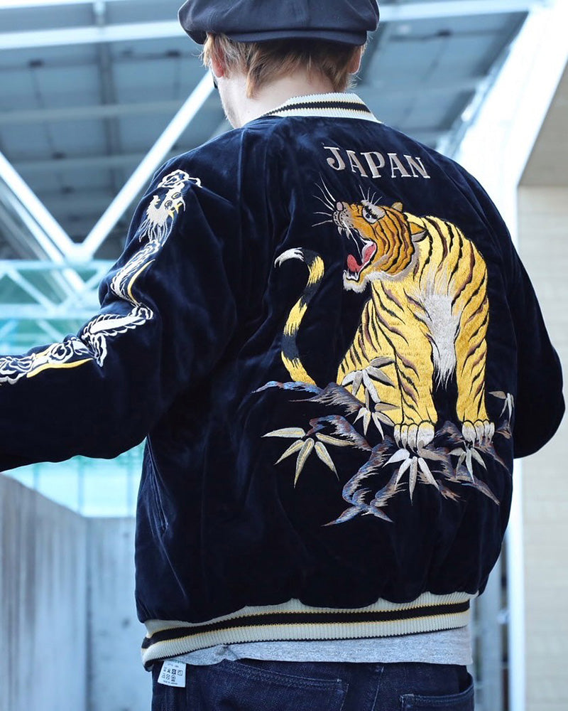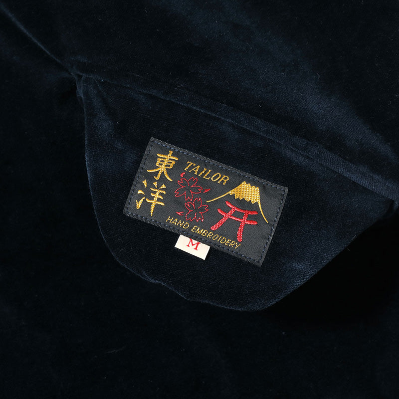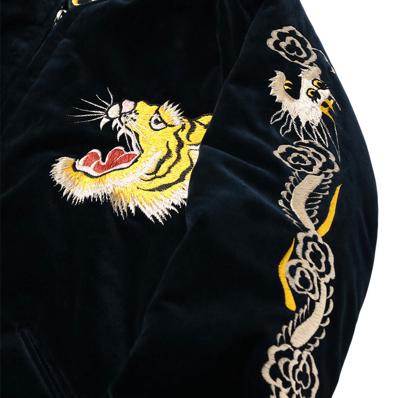 岩場に鎮座する虎を描いた作品。マットなダークネイビーの別珍生地に光沢感のあるレーヨン糸のイエローが際立っている。程よくデフォルメされた虎の刺繍は他のヴィンテージスカジャンの刺繍に比べて一回り大きく、インパクトある仕上がり。特徴的な書体の「JAPAN」の文字や、通常より縦に長い袖の昇龍もポイント。