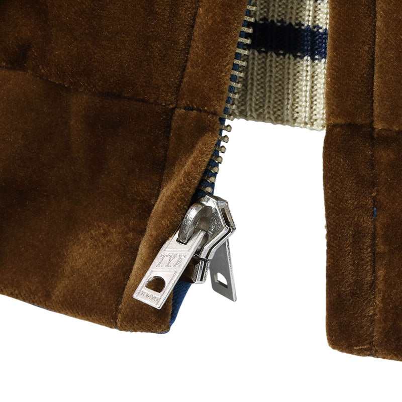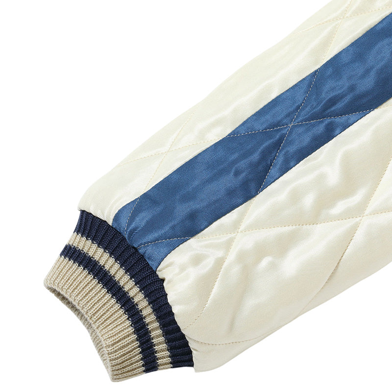 初期のスーベニアジャケットはアセテート生地のリバーシブル仕様が多いが、当時のバリエーションとして毛羽感のある別珍(べっちん)生地を使ったモデルも存在する。中綿を入れることで防寒性を高め、リバーシブル面のアセテートには中綿を押さえるためのキルティングが施されていた。