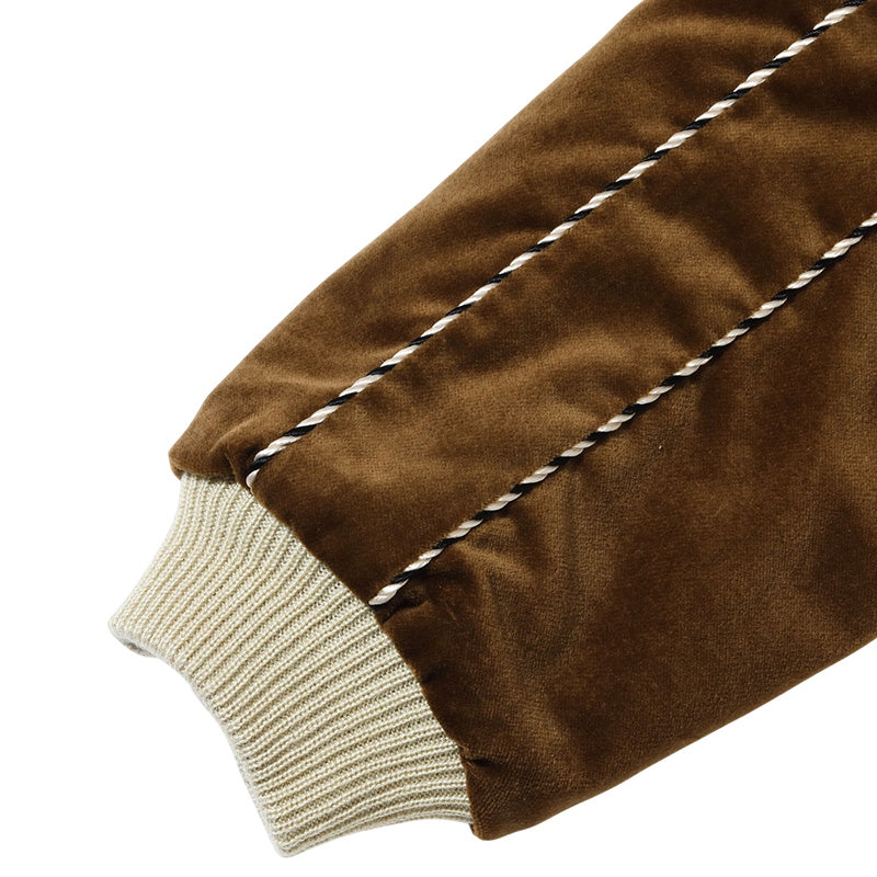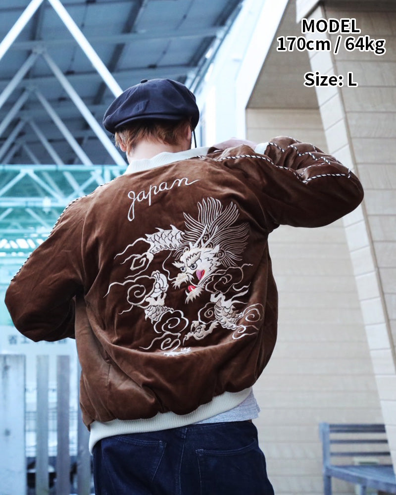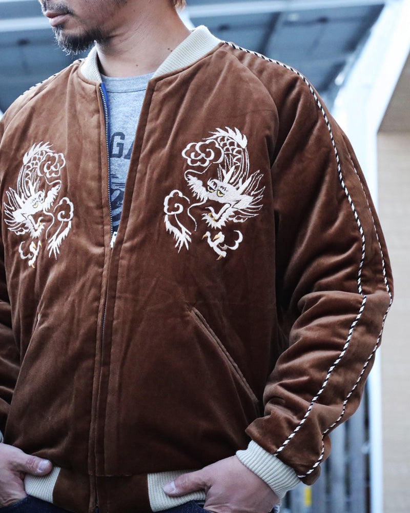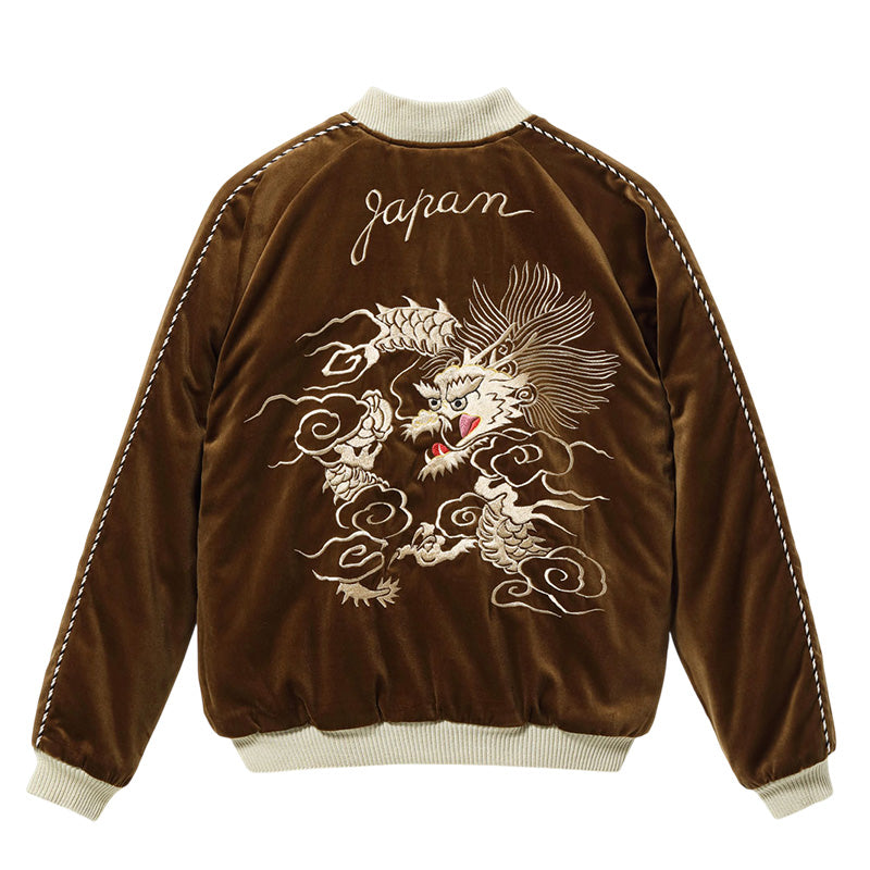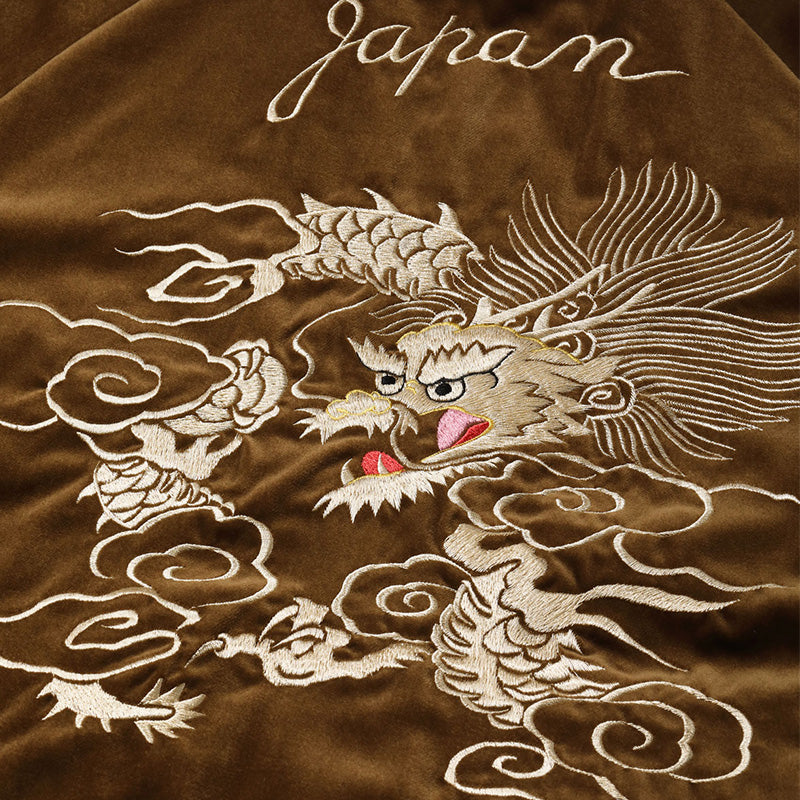 ヴィンテージでも珍しいブラウンの別珍生地で仕立てられた一着。雲間から見え隠れするほど長い体躯を持つ白龍の絵柄は、1950 年代中期のヴィンテージを再現したもの。鬣をなびかせて大空を舞う龍を白を基調とした色糸で立体的に刺繍し、縁取りのイエローや舌のレッドなど部分的に別の色を使うことでインパクトを持たせている。
