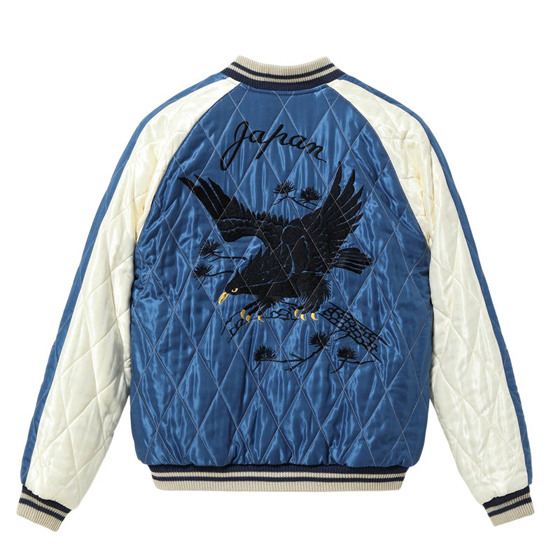 リバーシブル面は晴れ渡る空を想わせるブルーのアセテートに施された黒鷲の絵柄。使用する色糸の数を抑え、運針のみで翼を広げた姿を描写している。刺繍の密度が高い鷲に対し、生地の色を生かして繊細な線で描かれた松の枝や余白のバランスの使い方が日本画にも似た芸術性の高い作品。