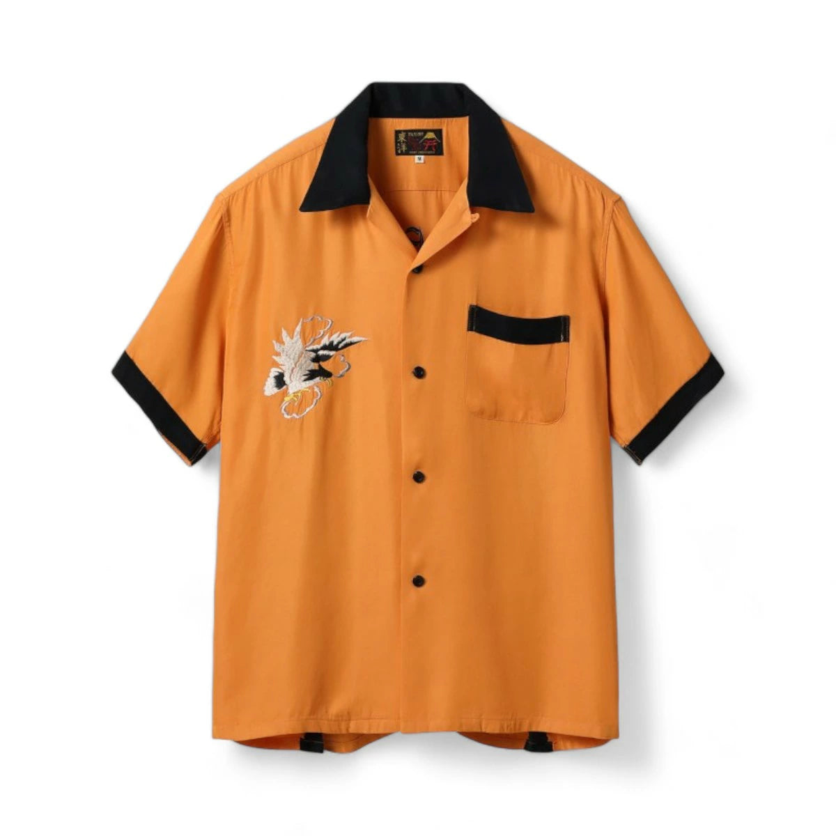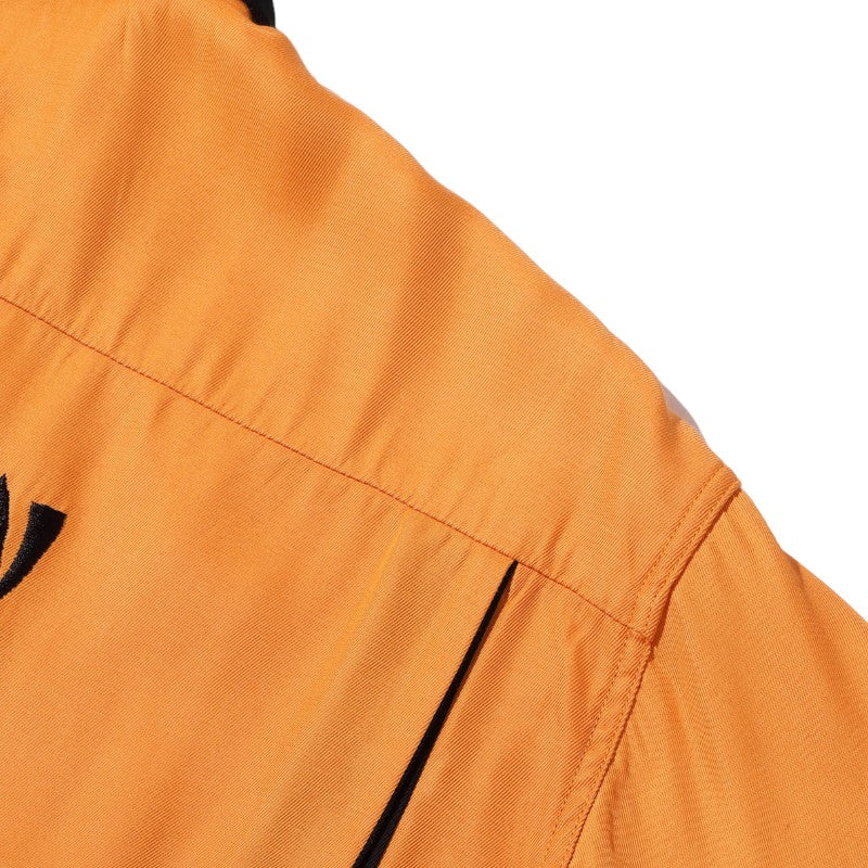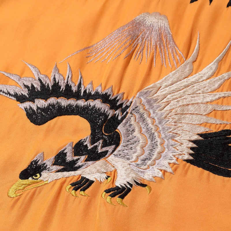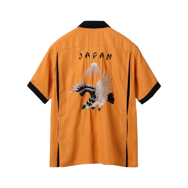 1950年代にスカジャンに描かれた図案をボウリングシャツ型へ落とし込んだ一着。アメリカの国鳥である鷲の繊細な刺繍が、当時アメリカで流行していたボウリングシャツのボディにマッチしている。襟や袖口、アクションプリーツの色を身頃と切り替えることで、デザインのアクセントとしているのも特徴。軽やかなレーヨン素材のため、夏場でも気軽にスカジャンの雰囲気を味わえる一着に仕上がった。