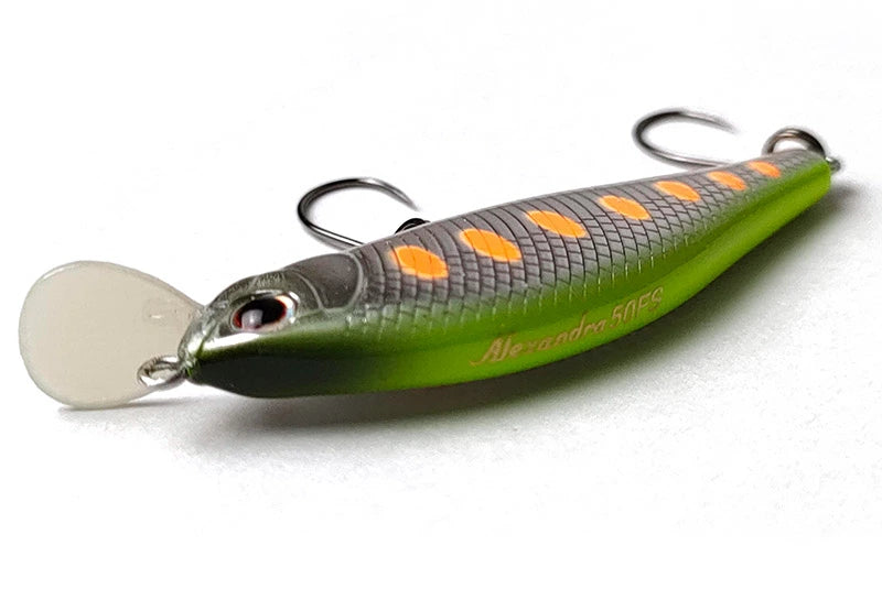 2004年にリリースされヘビーシンキング全盛との中で惜しまれつつ廃盤となったアレキサンドラの原点とも言えるデビューモデルをリメイク。水温の上昇とともに渓流魚の意識は水面付近に集中、フィーディングレーンで狡猾に餌を待つことが多くなります。フラッターシンキングはアップストリームを基本にロッドワークでルアーを操作、軽快に攻め上がり、魅力的な着水音からキレのある連続ヒラ打ちが最大の特徴です。沈下速度の遅さは細流や沢、渇水期のハイプレッシャーな流れはもちろん、水面直下や浅い瀬のレーンを攻めるのに効果を発揮します。流れに乗って自然に舞うように流下させ、自然なバイトを誘発、沈下の早いタイプとレンジを釣り分ける楽しさも得られます。基板リップが強度とレスポンスの良さを発揮、強気なプレゼンテーションが可能になりました。