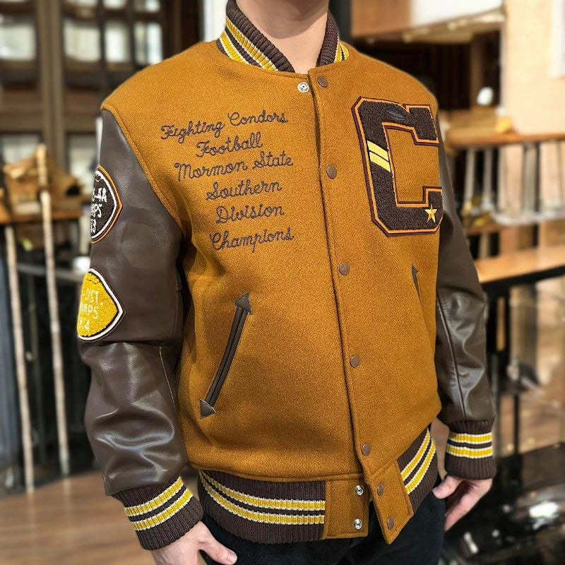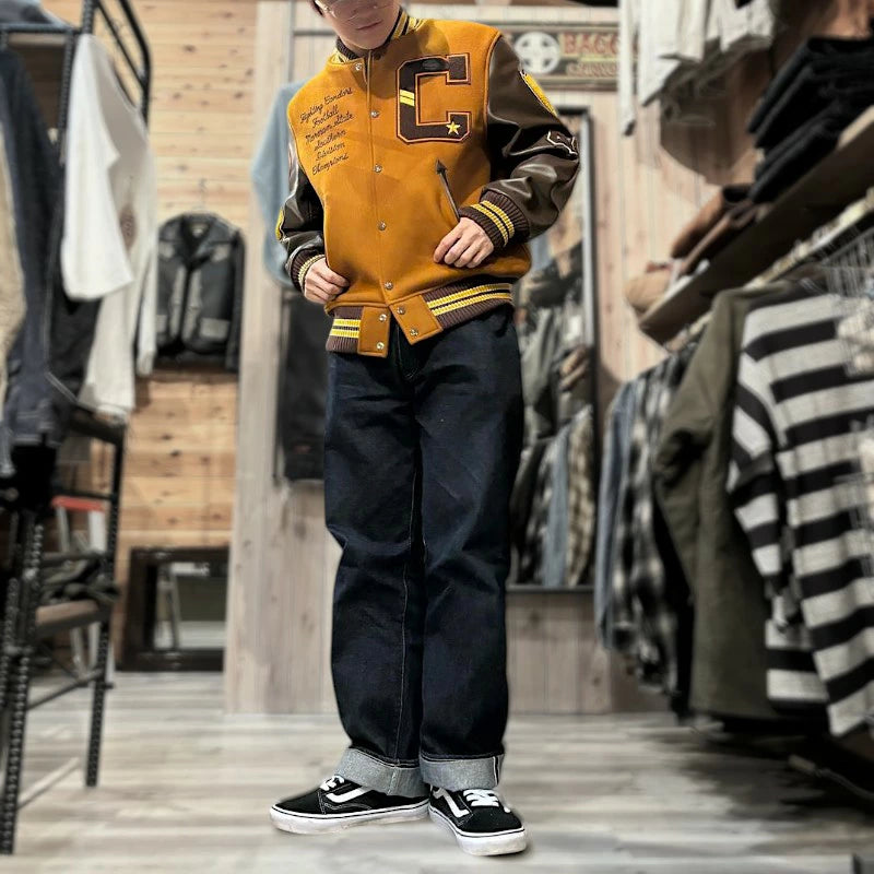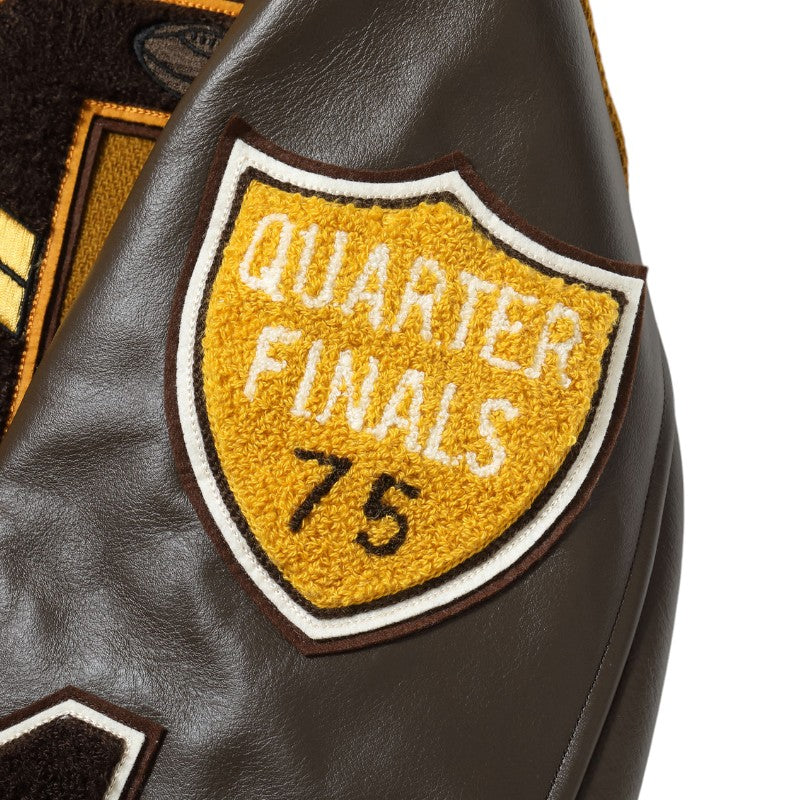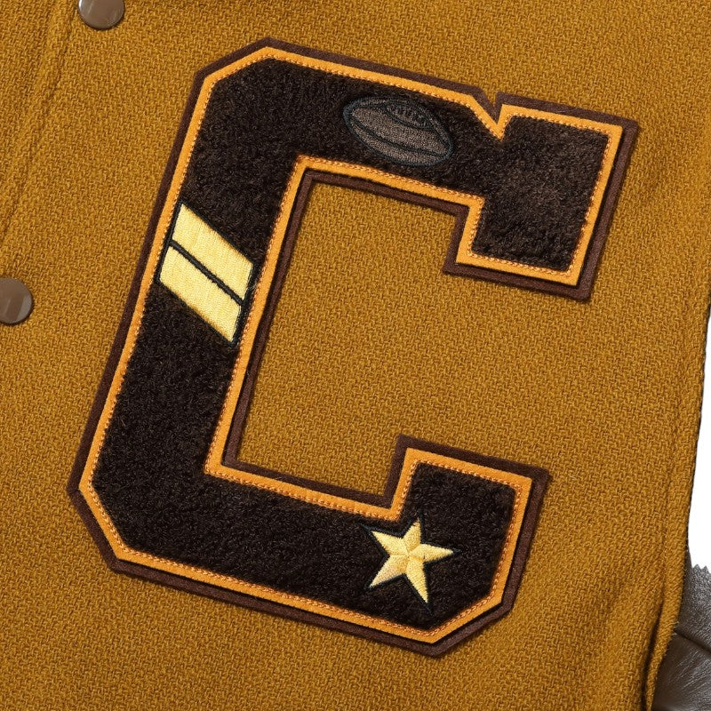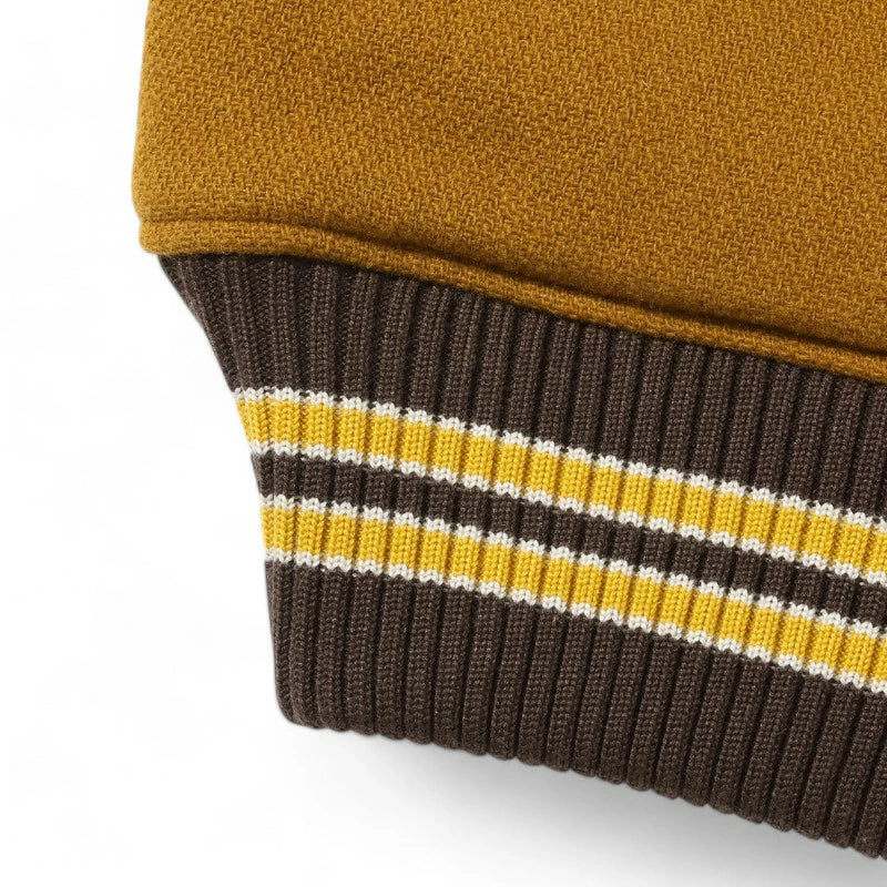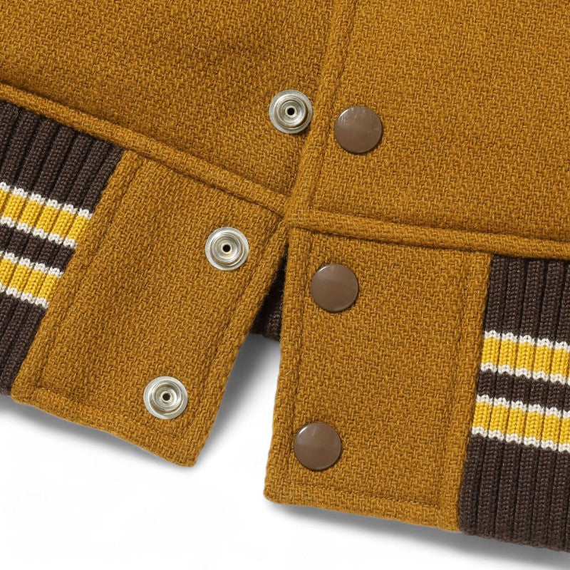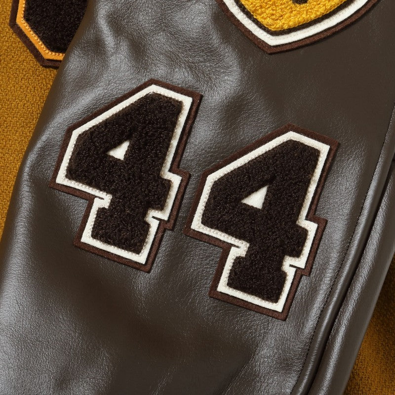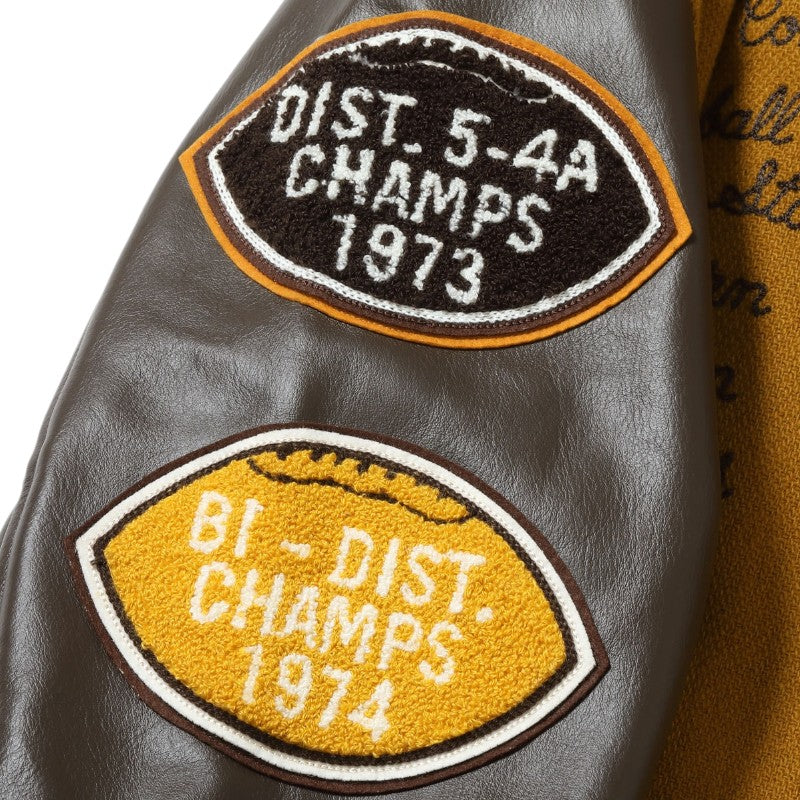 w30オンスのウールメルトンとステアハイドを使った頑丈なアワードジャケットのスタイルは1930年代に確立された。以降、現代までそのスタイルは愛され続けている。この一着はゴールドとブラウンの配色で、クラシカルな雰囲気を醸し出している。またチェーン刺繍やシニールにも同系色を使用しており、統一感のある仕上がりとなっている。