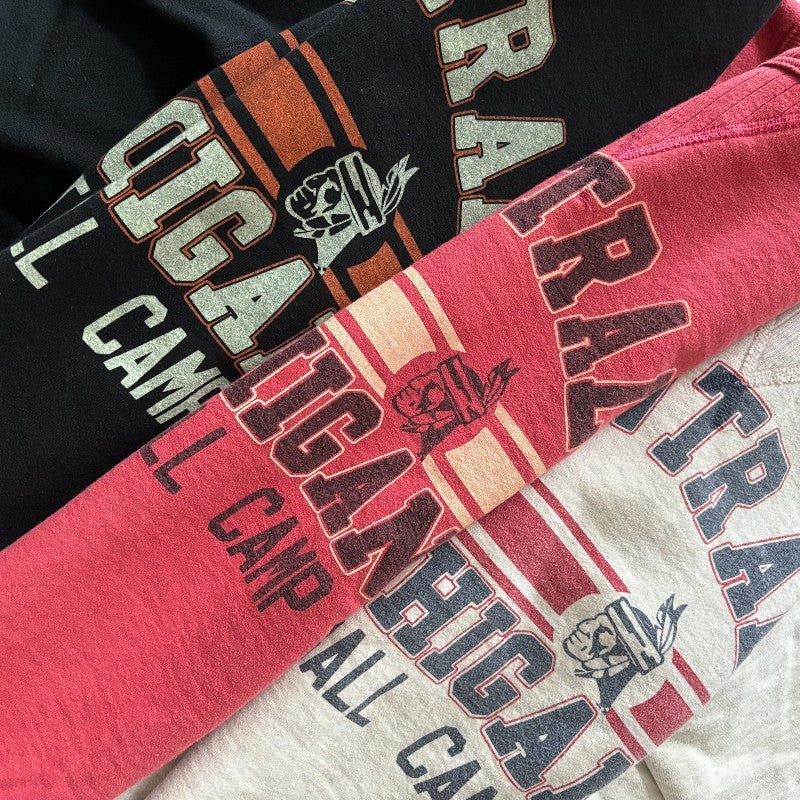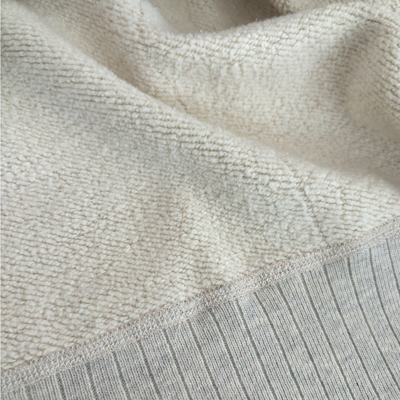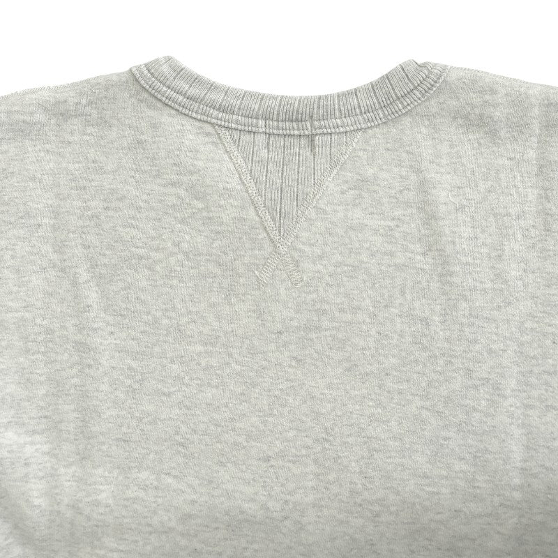 前後両方の首元にガゼットが付いた通称「両V」スウェット。表糸・中糸・裏糸を20/20/7の糸番手で編み立てたヘビーな生地を使用。