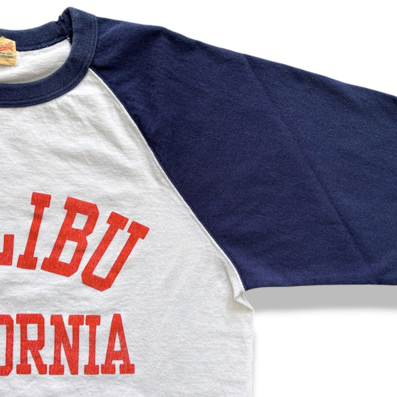 ネイビーの袖とホワイトのボディに、赤い「MALIBU CALIFORNIA」の染み込みプリントが映える、シンプルながらも存在感のあるデザインです。プリントは染み込み式で、洗うほどに風合いが増していきます。