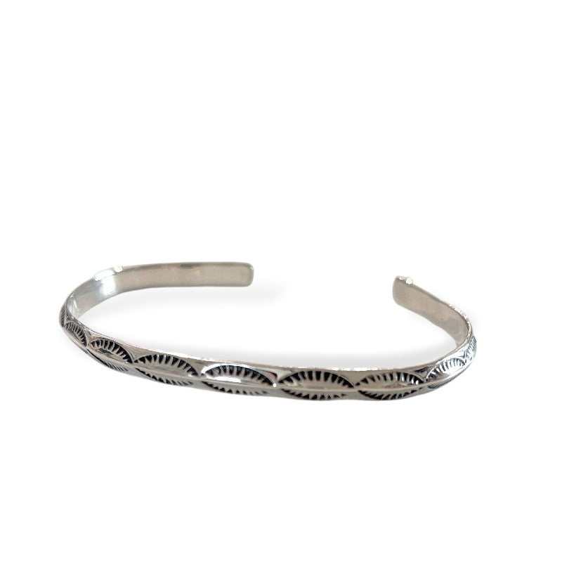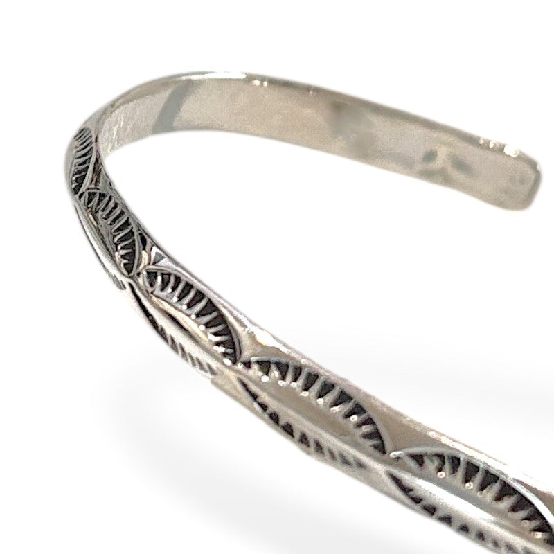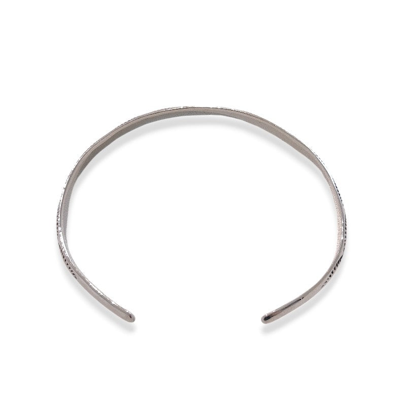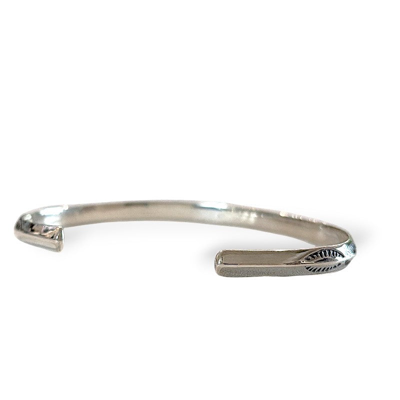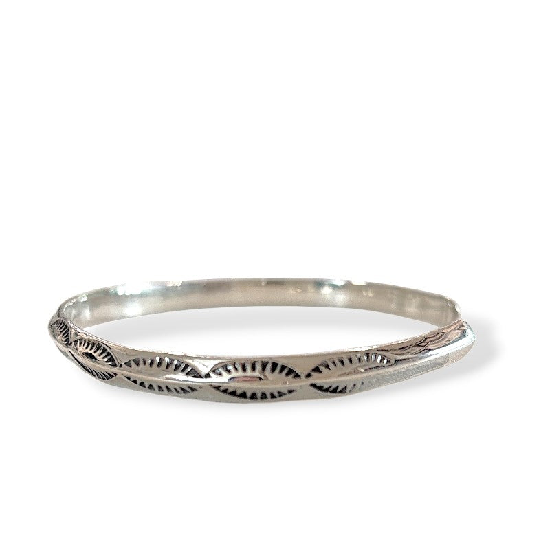 シャープな三角断面にスタンプワークを施した、細身のシルバーバングル。