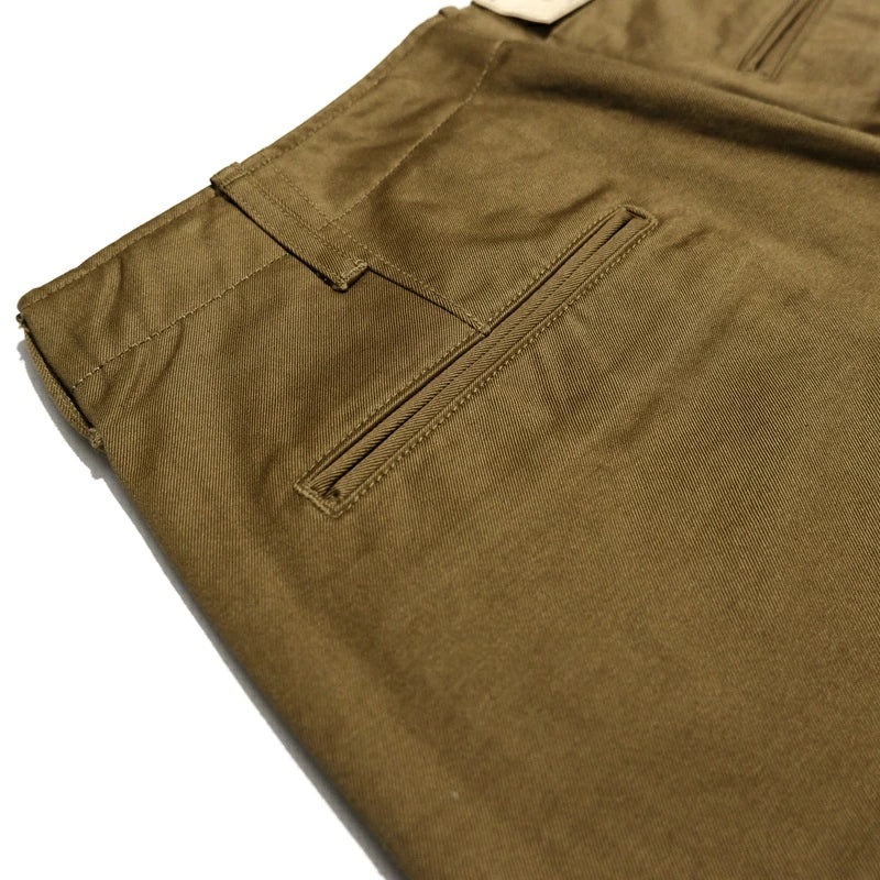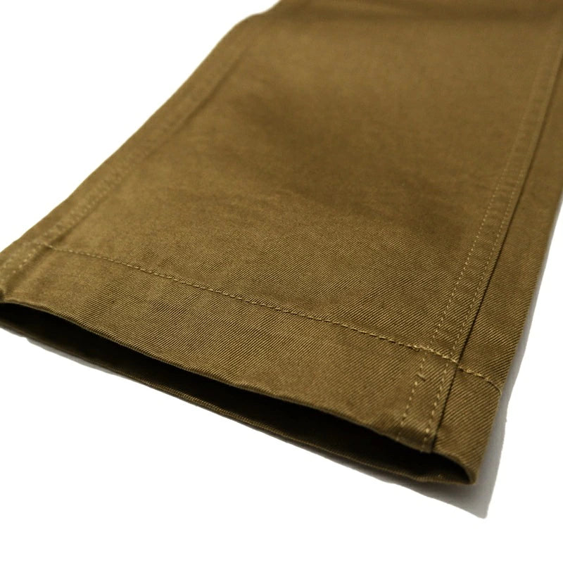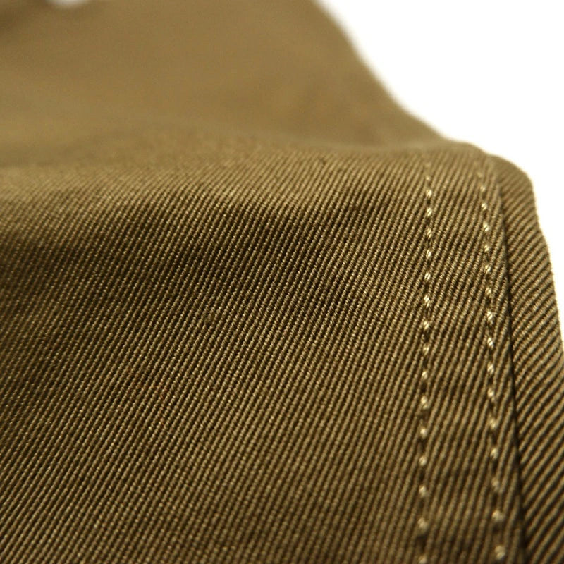 作業着のイメージが強い単糸のチノクロスではなく、双糸で非常に高密度に織り上げたウエストポイントを開発。 米軍のチノトラウザーのディテールをベースにし、縫製は強度も強く、経年変化も楽しめる巻き縫いを尻ぐり、脇線、内股に行った。 テーパードラインのタイト目のシルエットで上品な印象に仕上がっている。