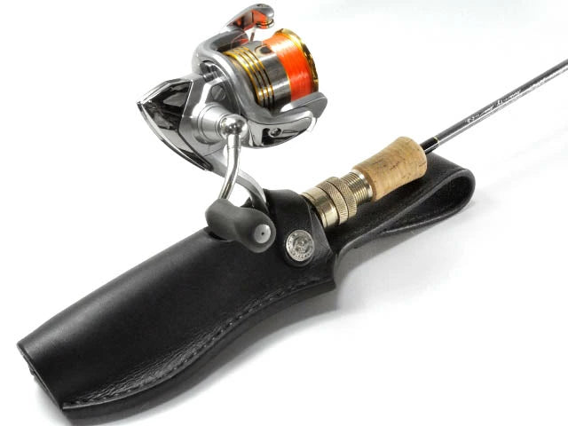 スピニング用のレザーロッドホルダー。ロッドを止めるフラップは着脱が簡単なギボシ留め。反対側にはワンポイントでコンチョをセット。