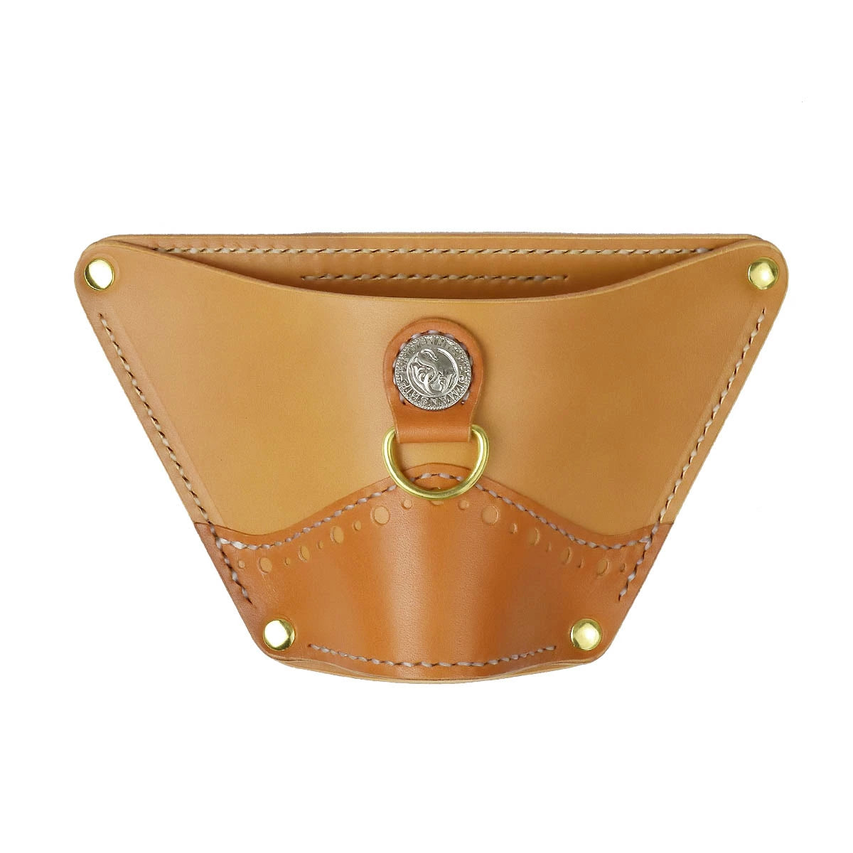 ランディングネット(釣り用の網)を収納するネットホルスター。ベルトに通して腰に装着するタイプ。厚みがあり型崩れのしないタフなボディ。メダリオンオーバーレイにより強度とデザイン性をプラスした。前面にDカンが付いているので、リーシュコードで繋いでおけば紛失防止にもなる。