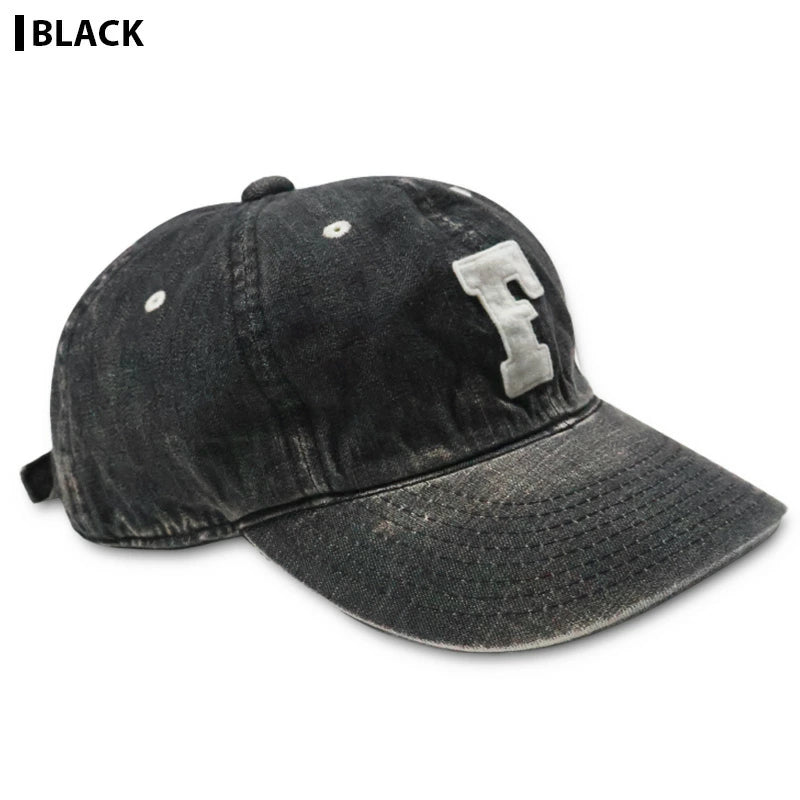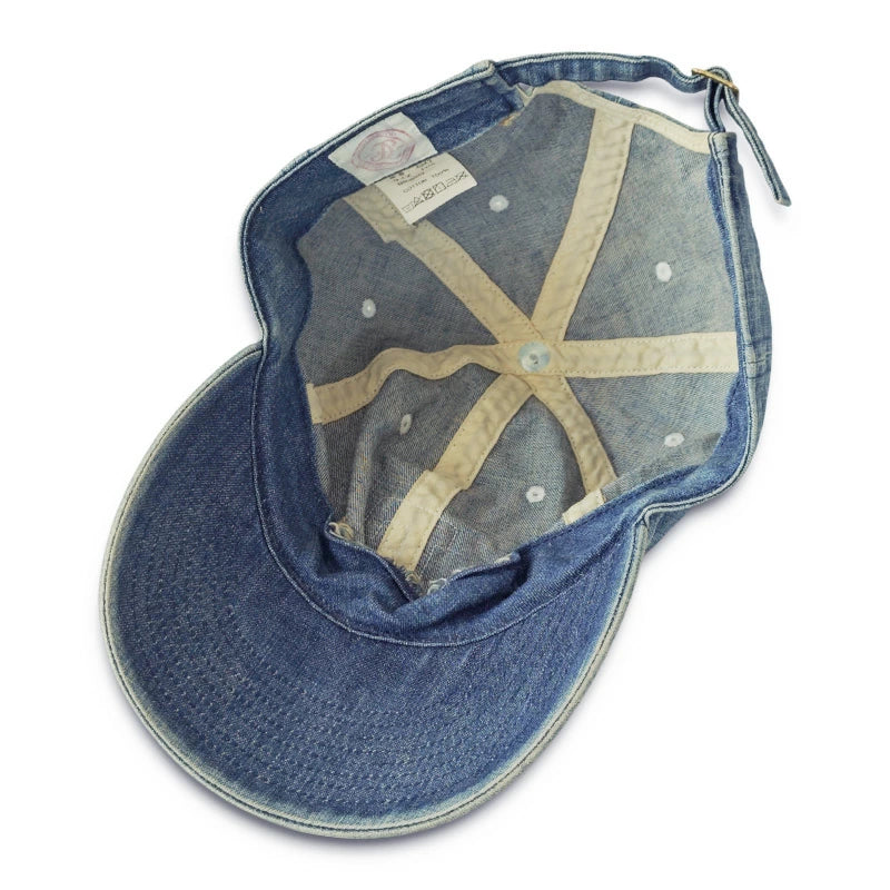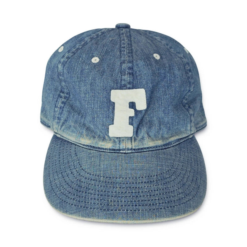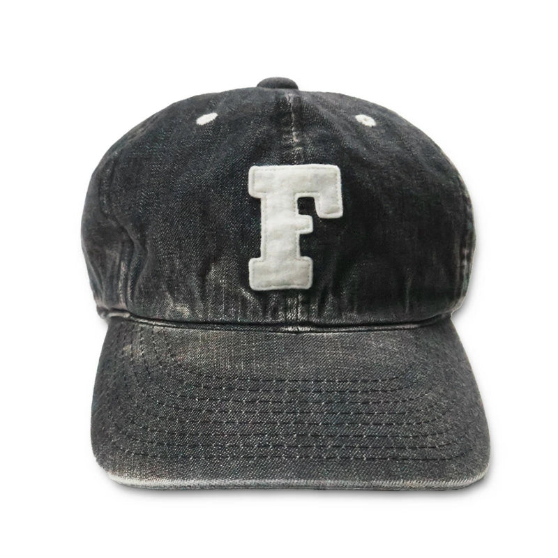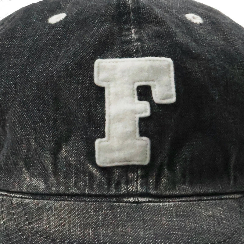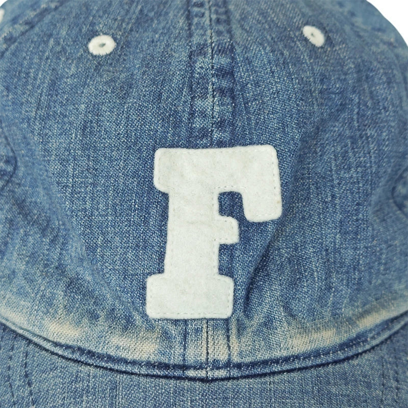 定番の6843 6Panel Denim Baseball Cap 'F' Patchに中古加工を加え、ヴィンテージデニムメカニックキャップの様なイメージを表現しました。