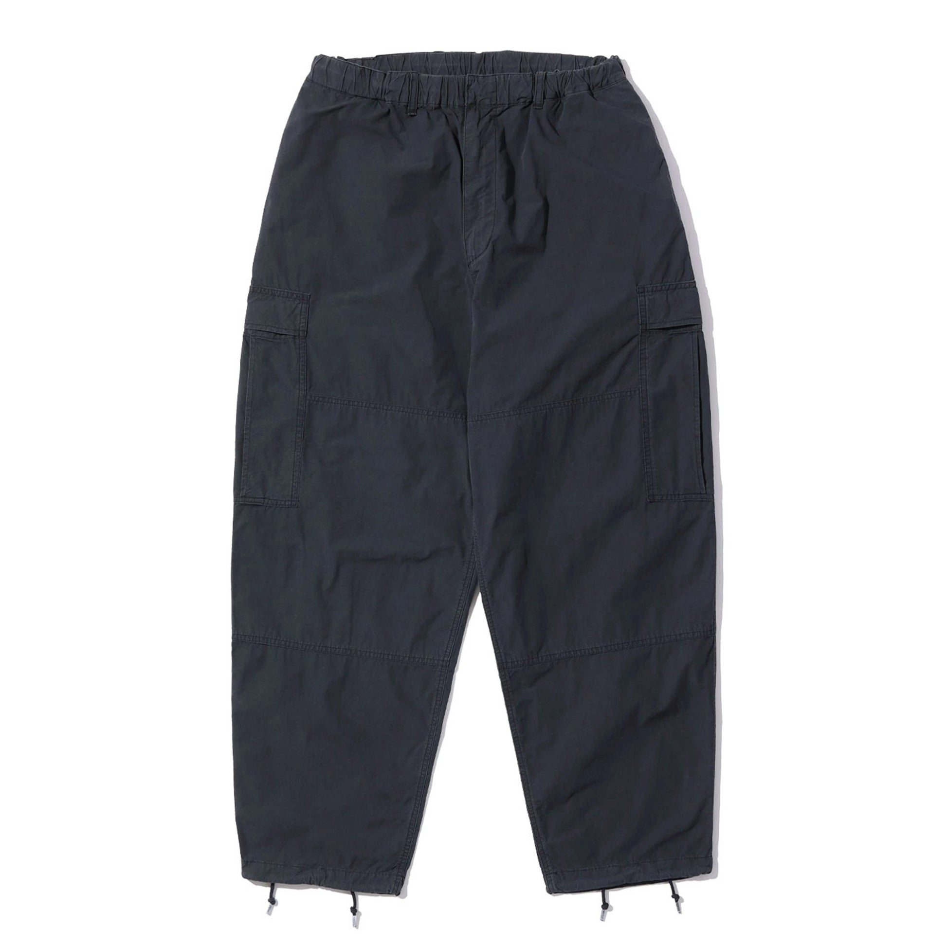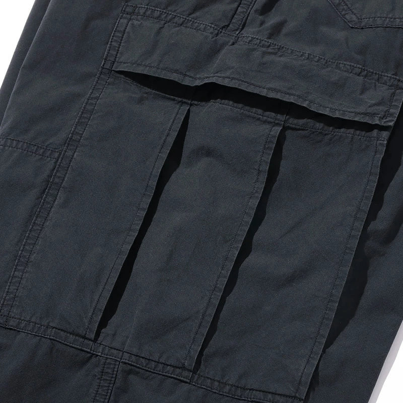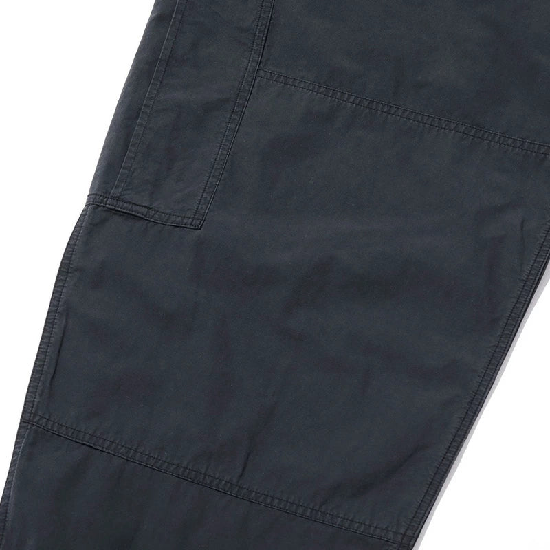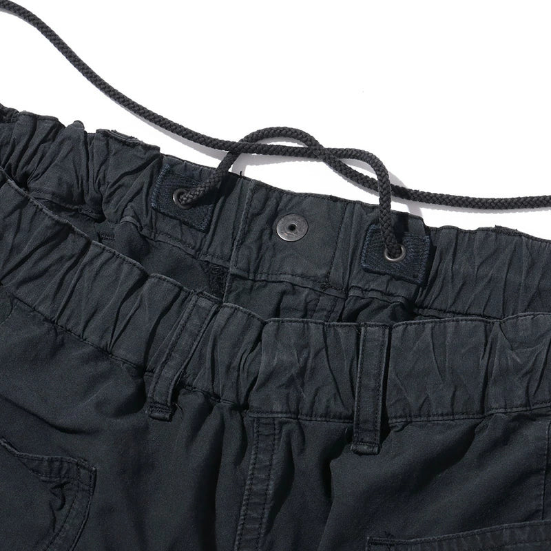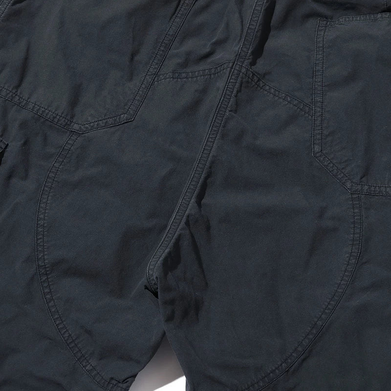 ブランドデビュー年にリリースしたMONKEY BUTT CARGO PANTSにマイナーチェンジを加えて製作。ウエストドローコードを内側へ移動、後太腿の切り替えを排除、ベルトループの追加を行っている。尻当て布と膝当て布は二重仕立てで補強。張り感のあるコットンナイロンウェザークロスにエイジング加工を施すことで、長年着用したような硫化染めならではの色落ちやアタリ感、パッカリングを表現している。。