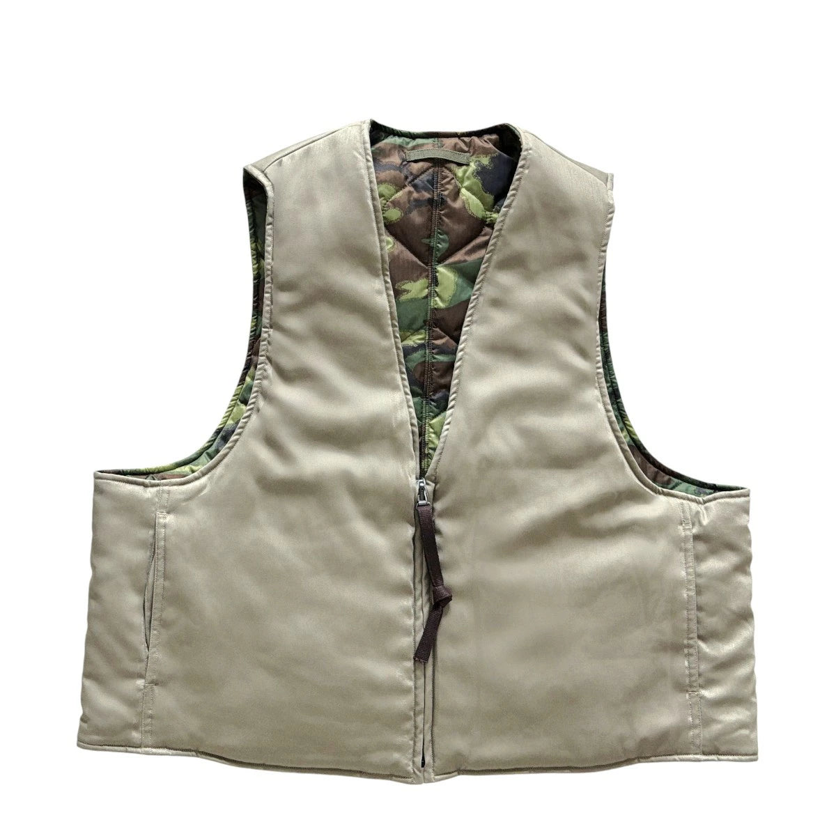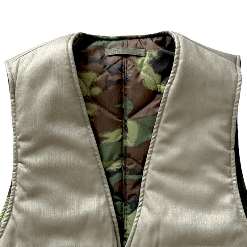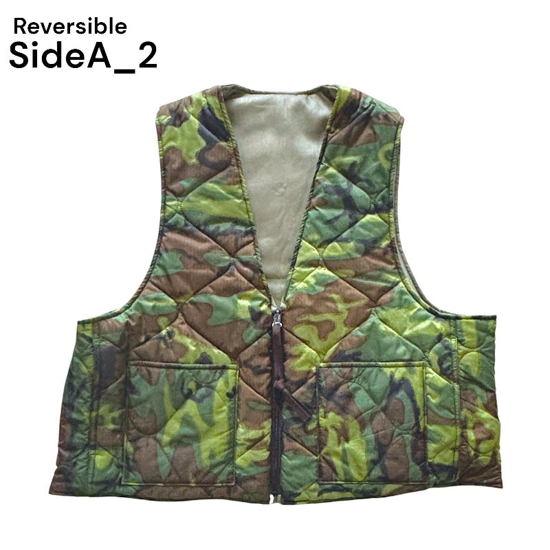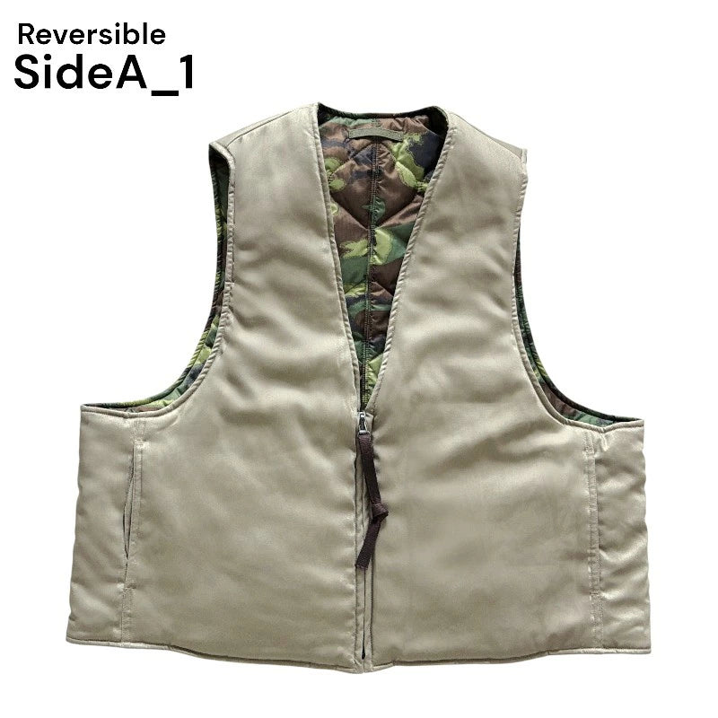両面A面仕様のリバーシブルベスト。少しサテンのような光沢のある無地面と、カモフラージュ面はキルティングと前ポケット、ハンガーループがデザインとして落とし込まれています。絶妙なショート丈とゆったりとしたサイズ感は、Tシャツに合わせてもアウターの上にでも合わせられる設計。