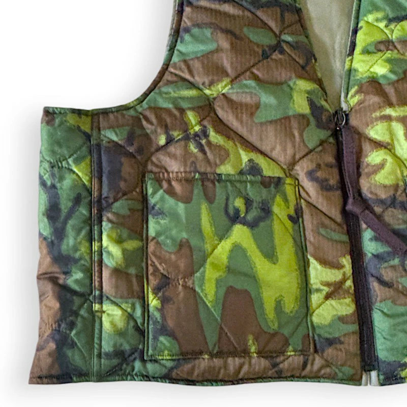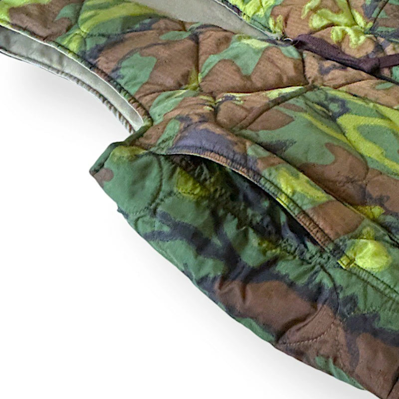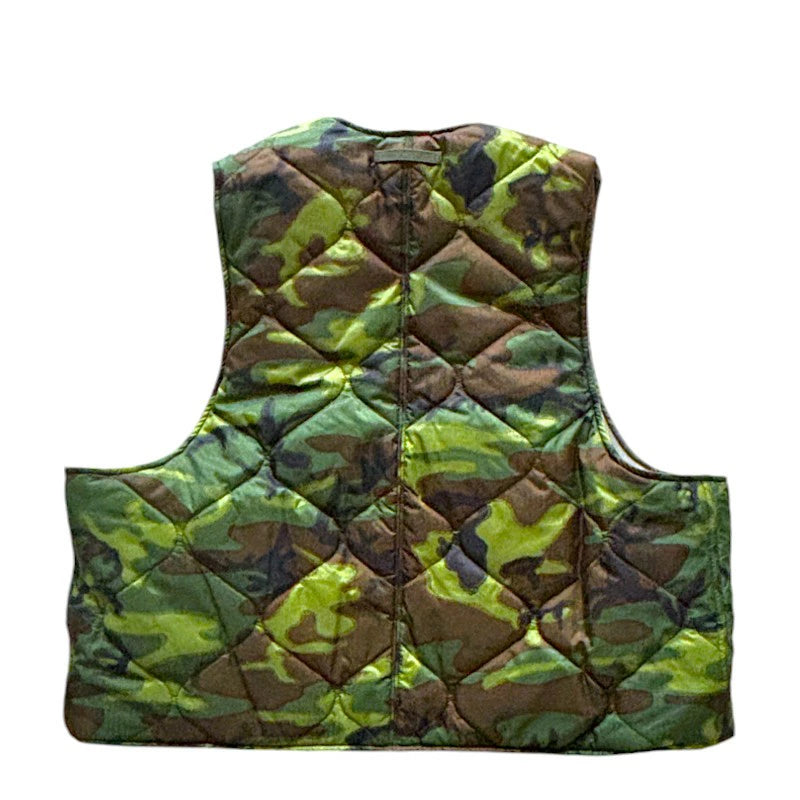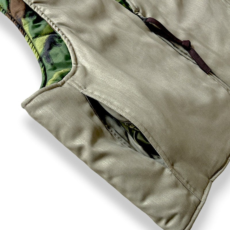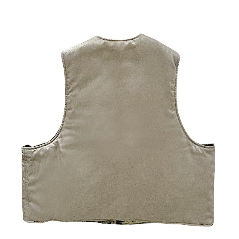 両面A面仕様のリバーシブルベスト。少しサテンのような光沢のある無地面と、カモフラージュ面はキルティングと前ポケット、ハンガーループがデザインとして落とし込まれています。絶妙なショート丈とゆったりとしたサイズ感は、Tシャツに合わせてもアウターの上にでも合わせられる設計。
