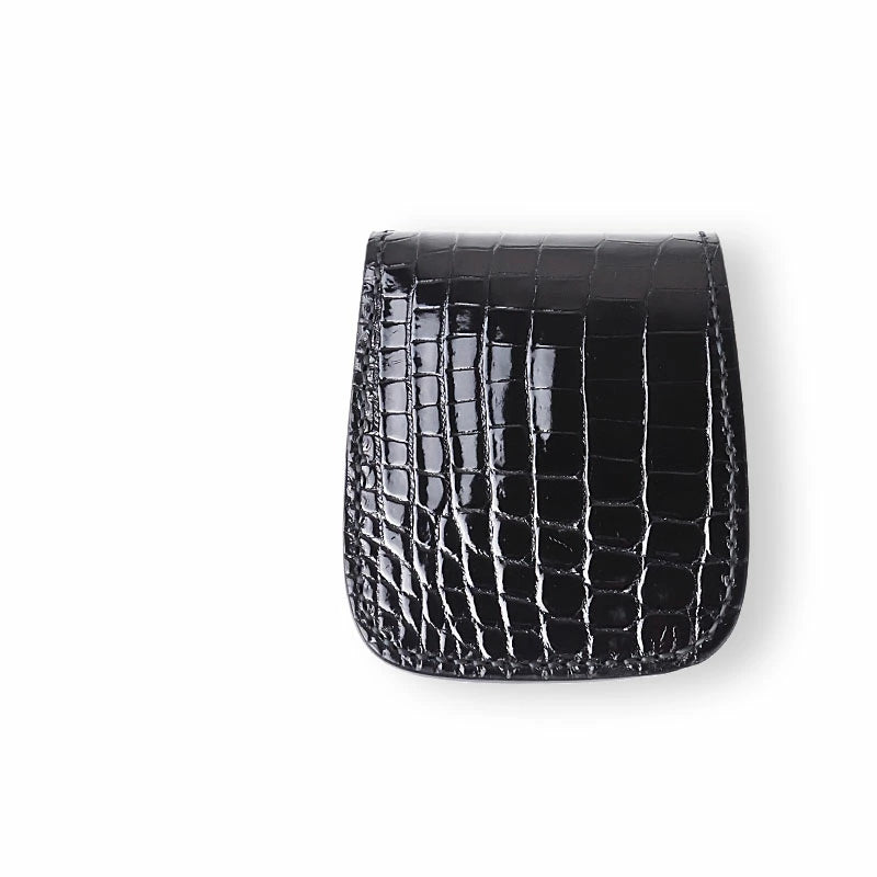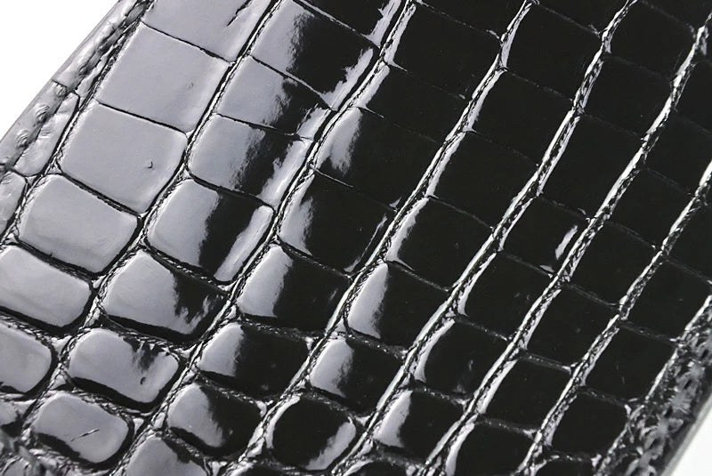 皮革の宝石と呼ばれるクロコダイルに、輝きと光沢が魅力のシャイニングで仕上げました。シャイニングはエナメル加工を施していると誤解されがちですが、表面にタンパク質バインダーと呼ばれる仕上げ剤を塗ってメノウの石で200キロ近い摩擦をかけて磨き上げることで、革に内包された油脂分を表面に一気に浮かび上がらせ、宝石のようなツヤを身につけます。シャイニークロコとも呼ばれます。
