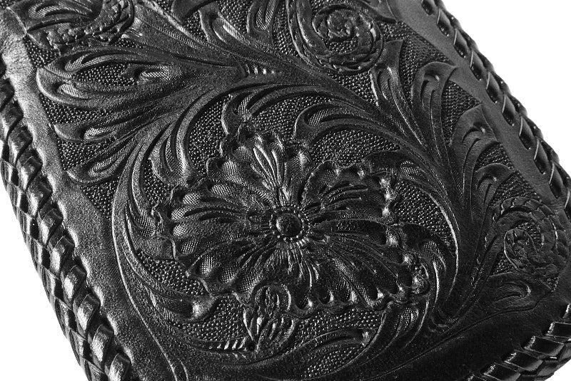シェリダンスタイルカービン用のツーリングレザーを黒染めした職人技をここぞと詰め込んだウォレット。