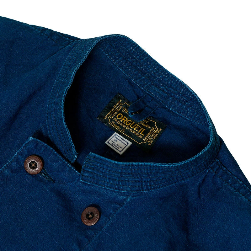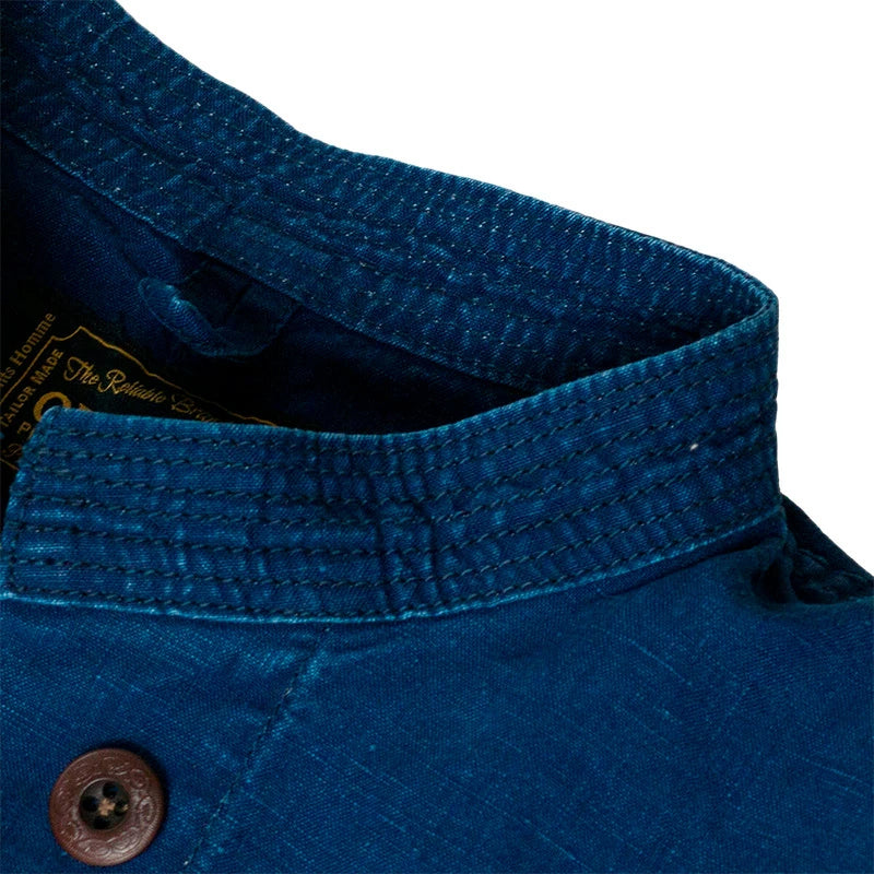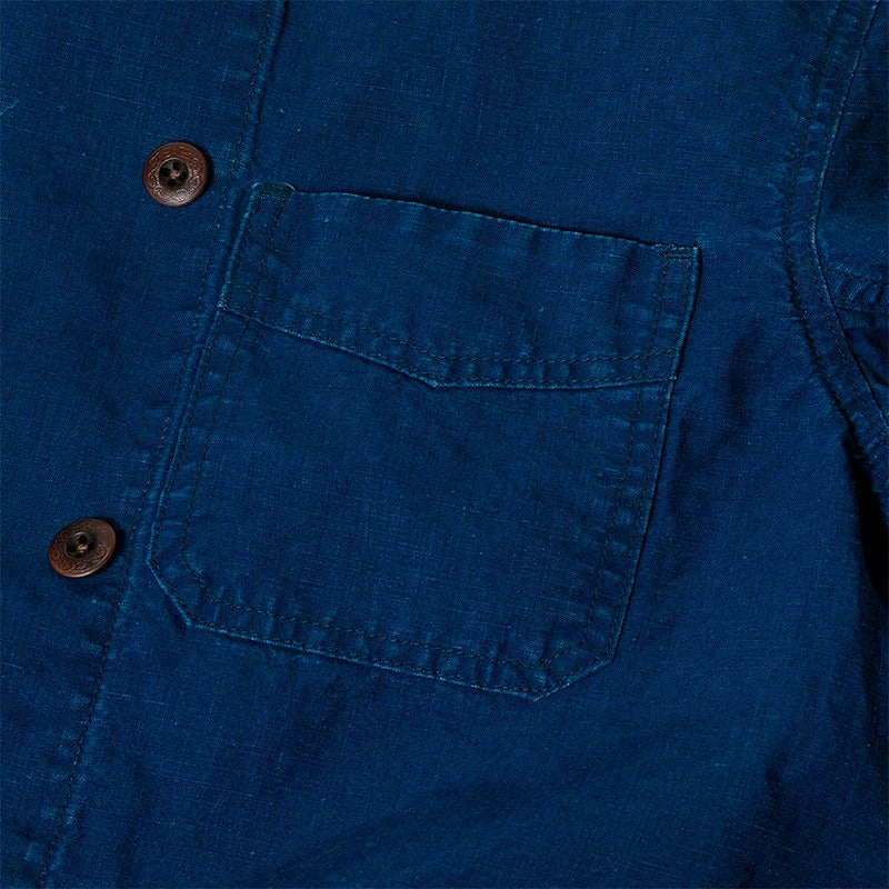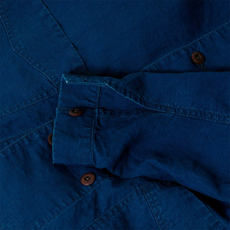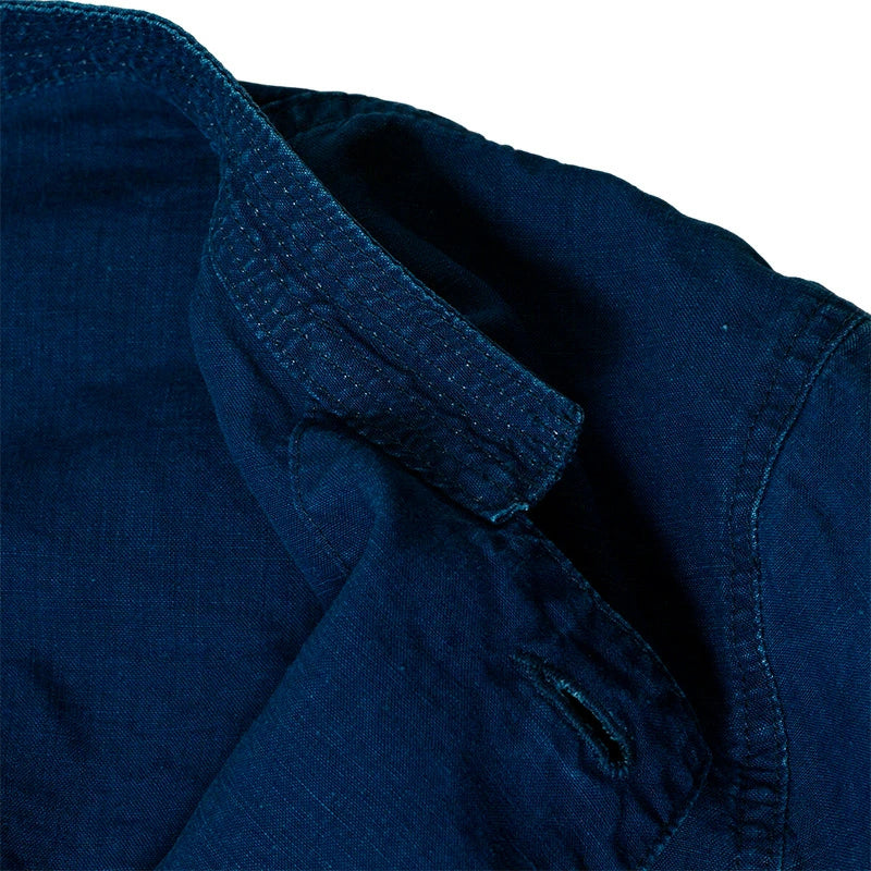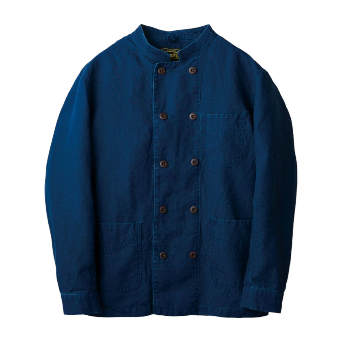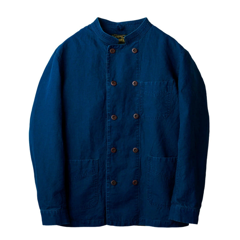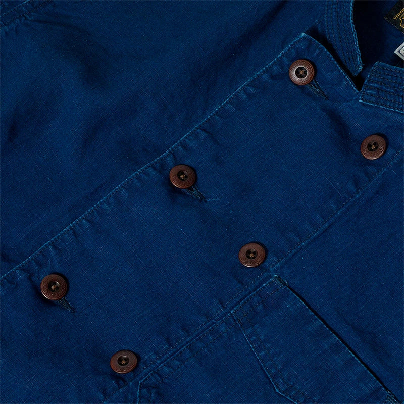 1900年代初頭のインディゴ・ダブルブレスト・ジャケットがデザインモチーフ。特徴的なVポケットの形状、防風のためのダブルブレスト、襟のステッチは強度を高め、美しい立ち上がりを実現するために施されております。素材には当時と同じくインディゴ・リネンを使用し、ヴィンテージ感を出すために色落ち加工を施し雰囲気を演出しています。