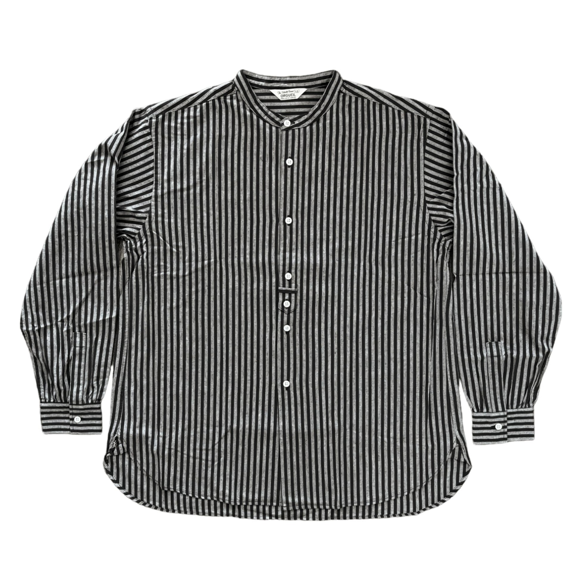 ヴィンテージのグランダッドシャツとして知られる、イギリスの労働者向けに作られたバンドカラーシャツがモチーフとなっています。元々は襟を切り替えられるシャツが基になっており、その歴史的な背景からナイトウェアとしても利用されてきました。通常はプルオーバータイプの被り物ですが、このデザインでは前開き仕様に変更し、タウンユースに適した仕様に仕上げています。フロントの前立て仕様や裾のマチなど、細部にわたるディティールも抜かりなく取り入れられており、本格的な作りのシャツとなっています。