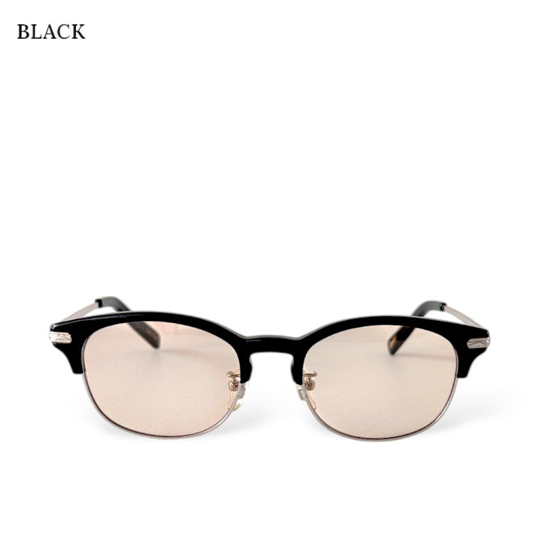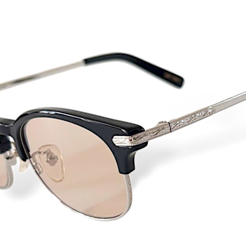眉が薄いことに悩んでいたモント将軍の為に威厳が出る眼鏡として作られた形状が由来のサーモント型をベースとしています。また、シェードを薄くすることで顔の表情も明るく写り、オンオフ問わず着用できる人気のアイテムです。
