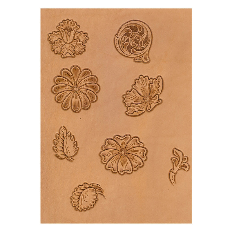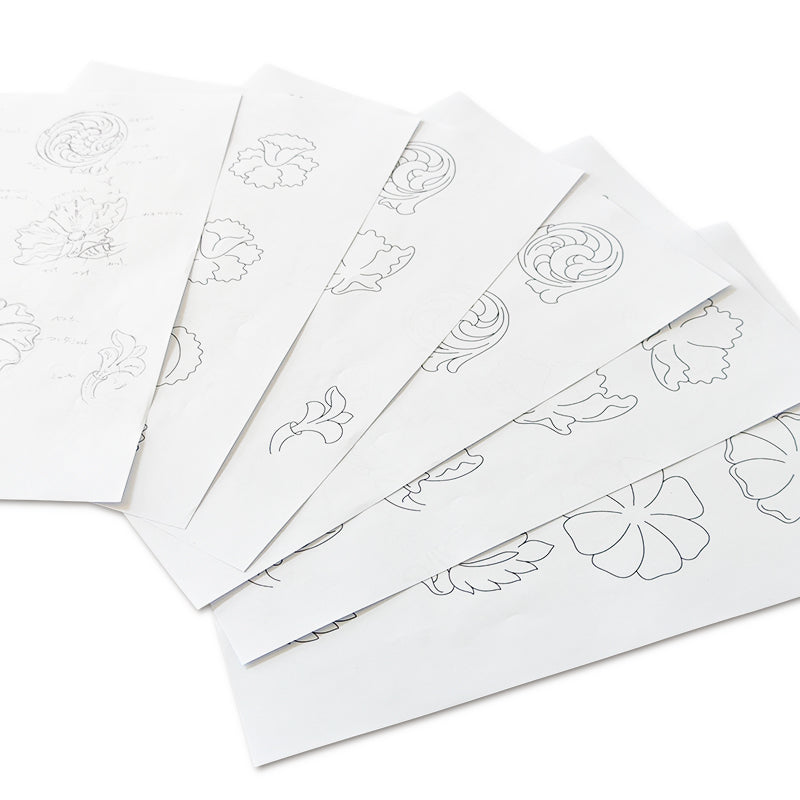 米国ワイオミング州・シェリダン地方に自生する野花をもとに描いたカービング用の図案です。シェリダン地方は古くから馬具や革細工が盛んで、その中で「シェリダンスタイル」と呼ばれる、花と唐草模様の流れるような曲線が特徴的なスタイルが生まれました。このパターンブックも、その伝統を踏まえながら新たなデザインを描き起こしています。