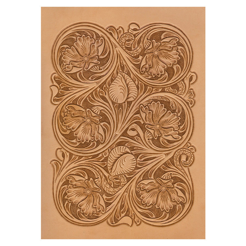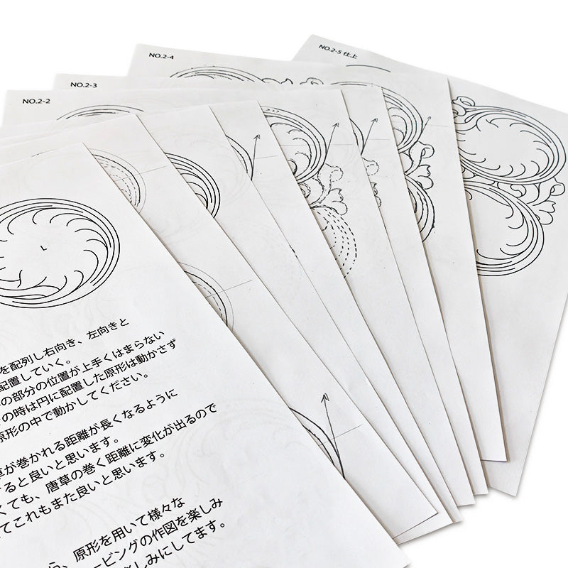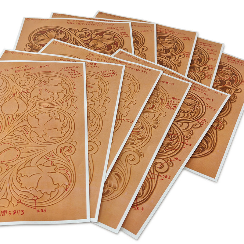 基本の円形唐草パターンから、複数のパターンを繋げる応用技術へとステップアップできる内容です。円形の唐草を2個、4個、6個と繋げていくことで、作品の幅が大きく広がります。2つ折り・3つ折りのロングウォレットやハーフウォレットはもちろん、さらに大きく繋げればバッグなどの大型作品にも応用できます。パターンの配置やバランスを考えながら、あなただけのオリジナル作品を生み出してください。