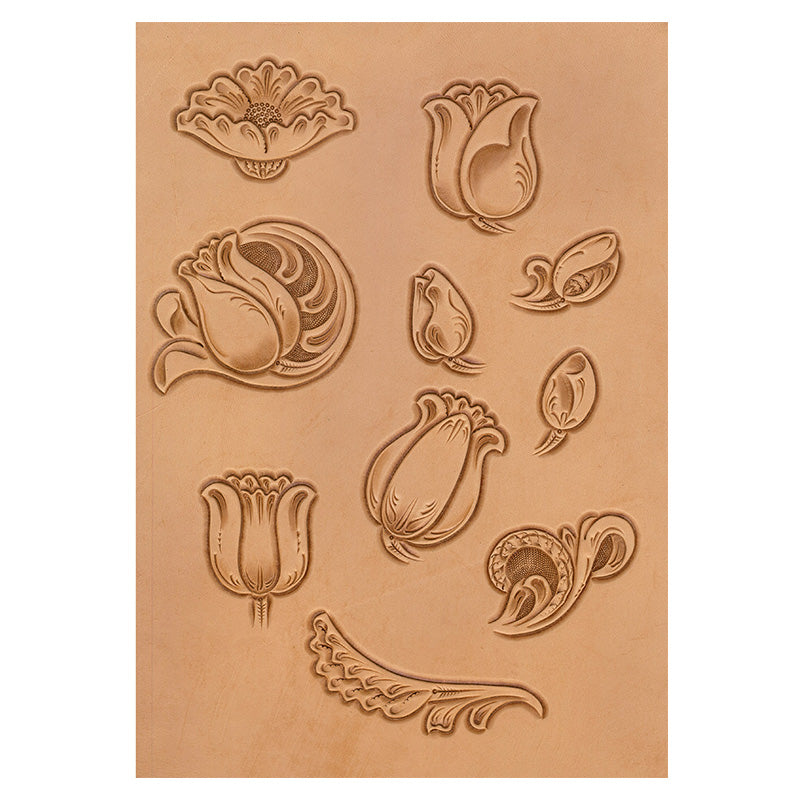 米国ワイオミング州・シェリダン地方に自生する野花をもとに描いたカービング用の図案です。シェリダン地方は古くから馬具や革細工が盛んで、その中で「シェリダンスタイル」と呼ばれる、花と唐草模様の流れるような曲線が特徴的なスタイルが生まれました。このパターンブックも、その伝統を踏まえながら新たなデザインを描き起こしています。