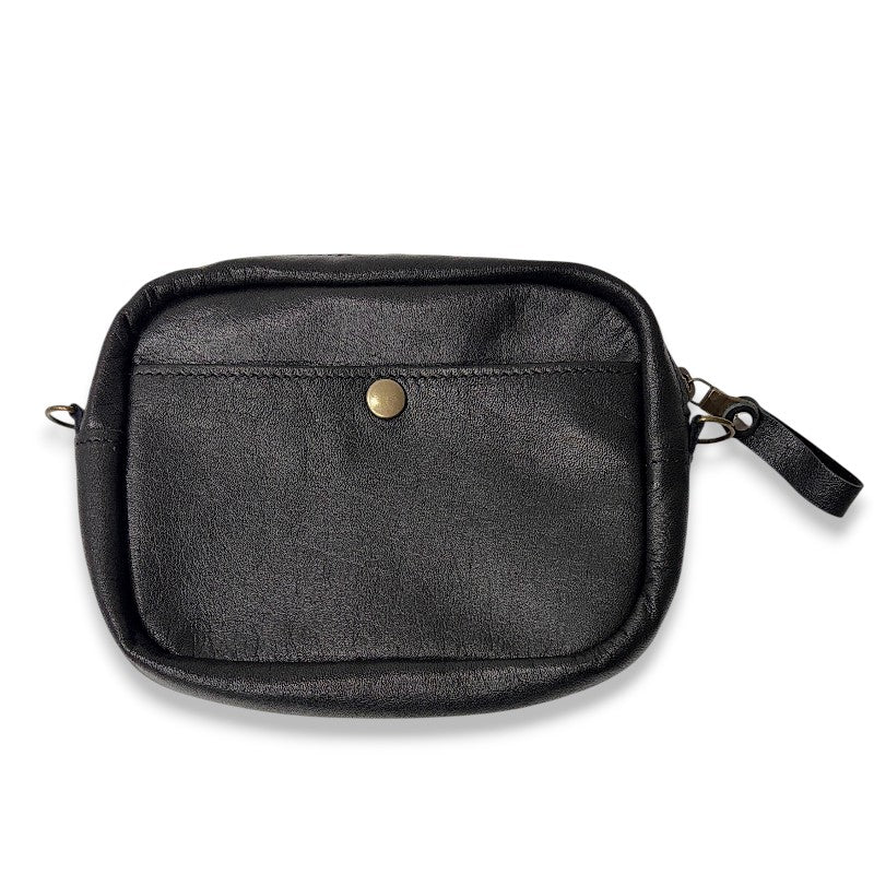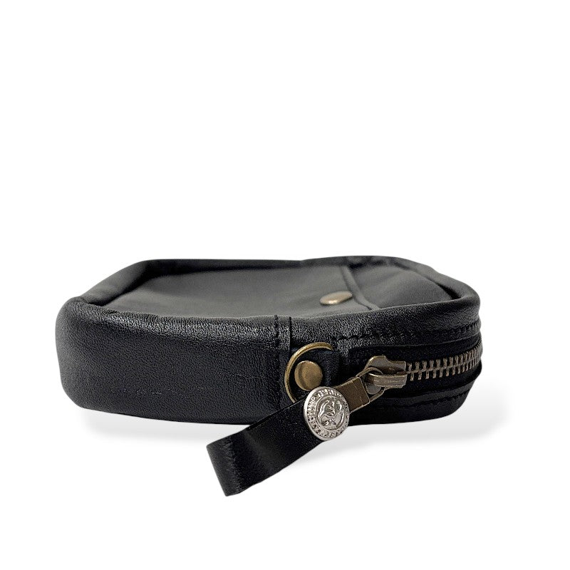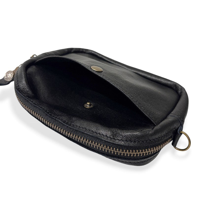 本体サイズは 175×140×50mm。iPhone 15 Pro(146.6×70.6×8.25mm)もしっかり収まり、さらにミニウォレットやキーリングも一緒に持ち歩ける小ぶりなサイズ感です。