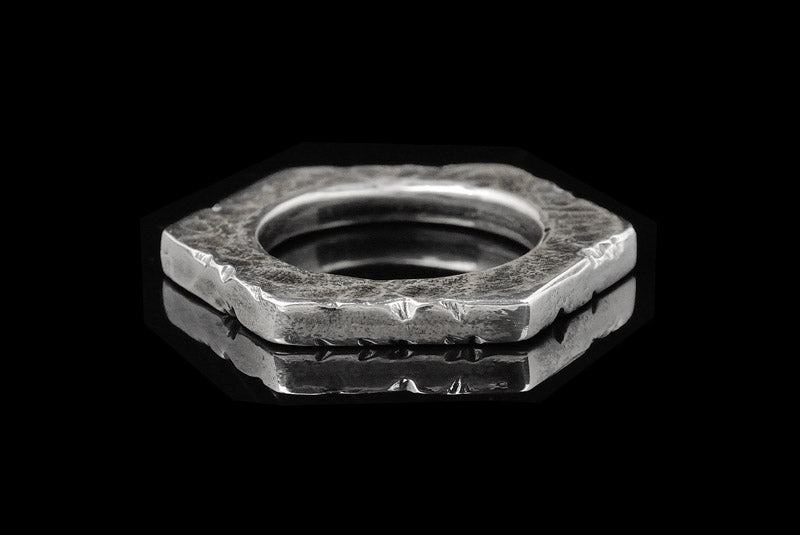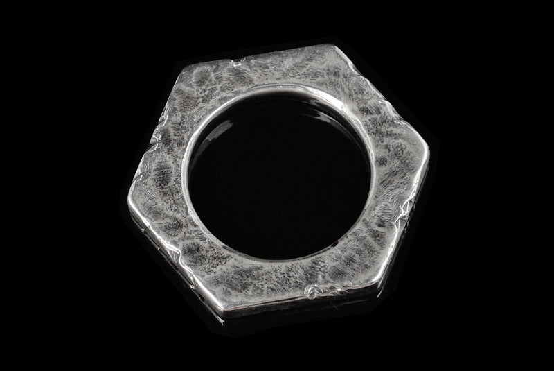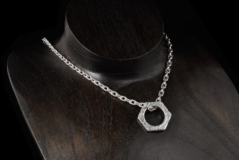 無骨さとクラフトマンシップを融合させた、Samurai Craft渾身のシルバーペンダント。 インダストリアルな六角ナットモチーフに、丁寧な槌目(ハンマートーン)加工を施し、金属の力強さと手仕事の温もりを共存させたデザインに仕上げました。 一点ずつ職人の手で仕上げられることで生まれる、唯一無二のテクスチャ。チェーンやレザーコードと合わせることで、ラギッドにもモダンにも表情を変える万能なトップです。 無骨なスタイルを愛する方、素材の質感を重視する方にこそ身に着けていただきたい逸品です。 シンプルにメインのトップとして、サブ的なペンダントトップとしてもお使いいただけます。