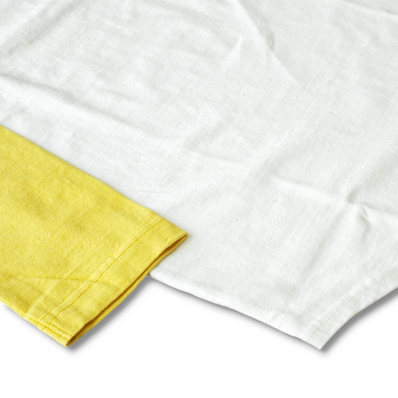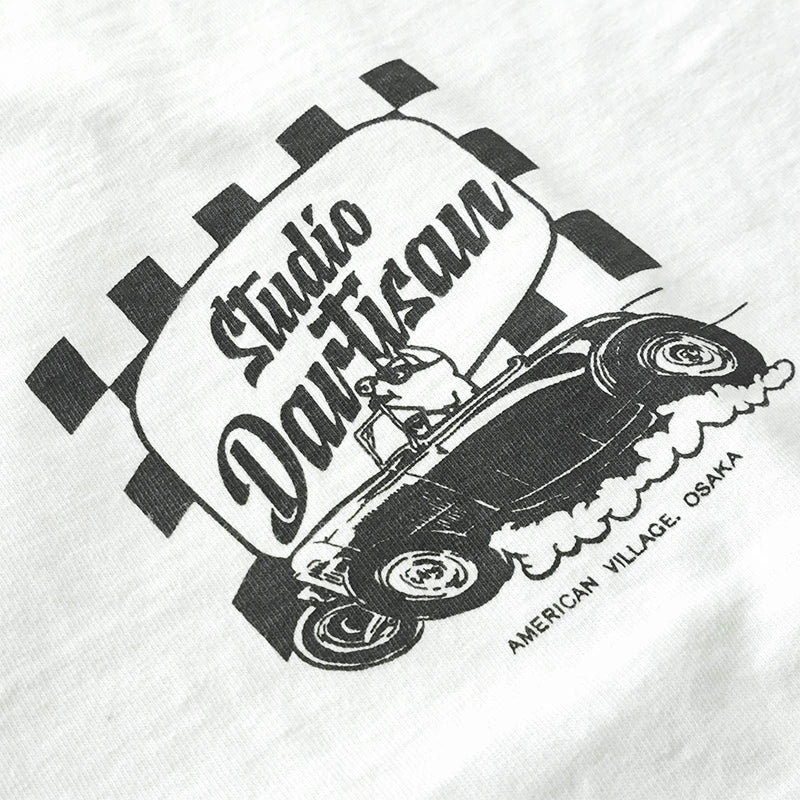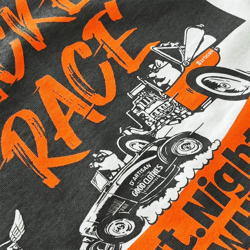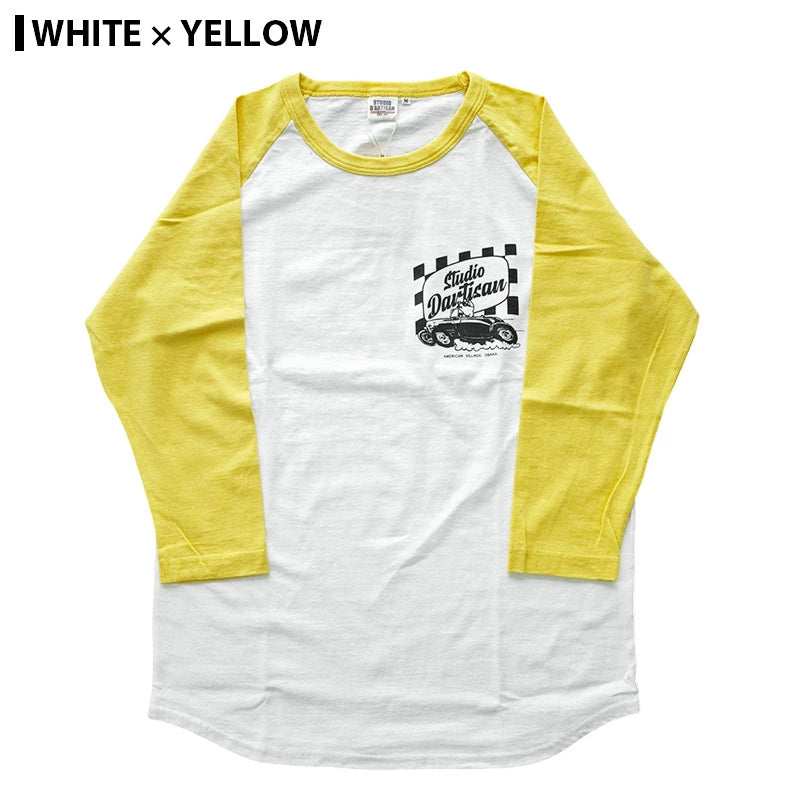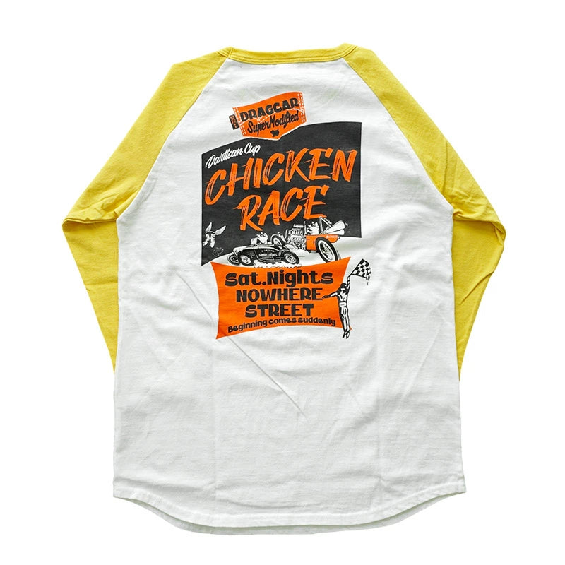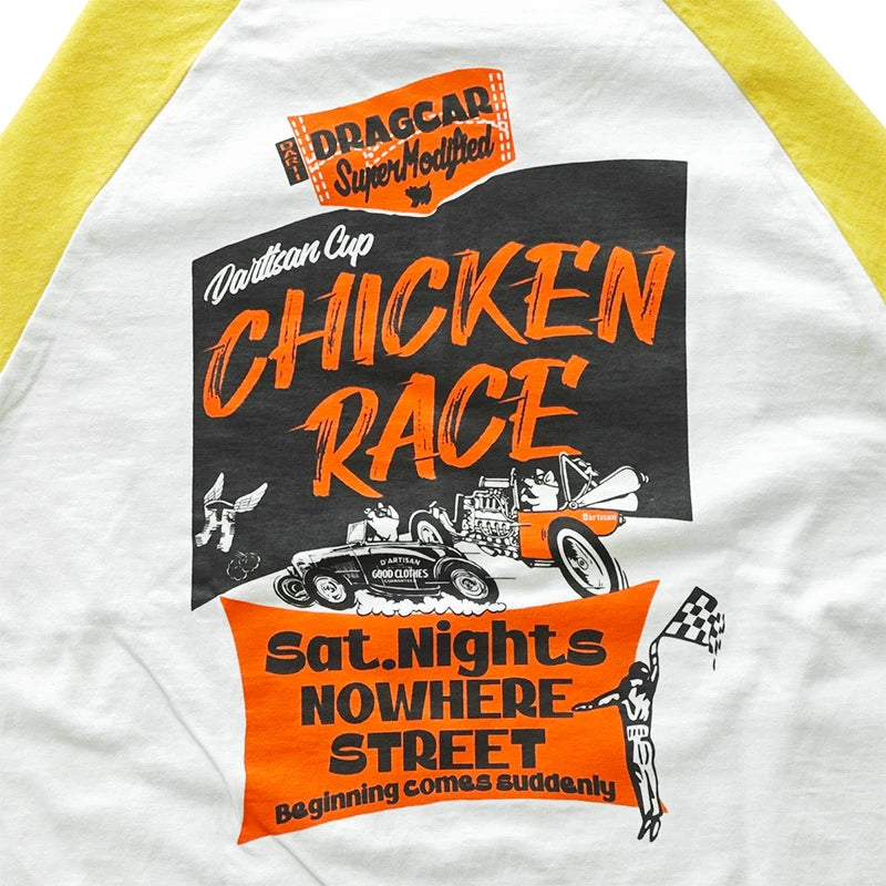プリントデザインと配色切り替えの袖がボリュームを感じさせる、アメカジ感たっぷりな7分袖Tシャツ。生地、縫製、プリントまで日本製にこだわったダルチザン人気のオリジナルアイテム。印象的な見た目の配色を切り替えたラグラン袖で、裾はラウンドカット。デザインは左胸+バックプリントのアメカジ王道配置で、インディとクリッパーがチキンレースで競い合うキュートでユニークなプリントが特徴。1枚着はもちろん、重ね着レイヤードにも適しており、1年を通して活躍する万能アイテム。どんなアメカジスタイルとも相性が良く、着こなしの幅が広いTシャツに仕上がっている。