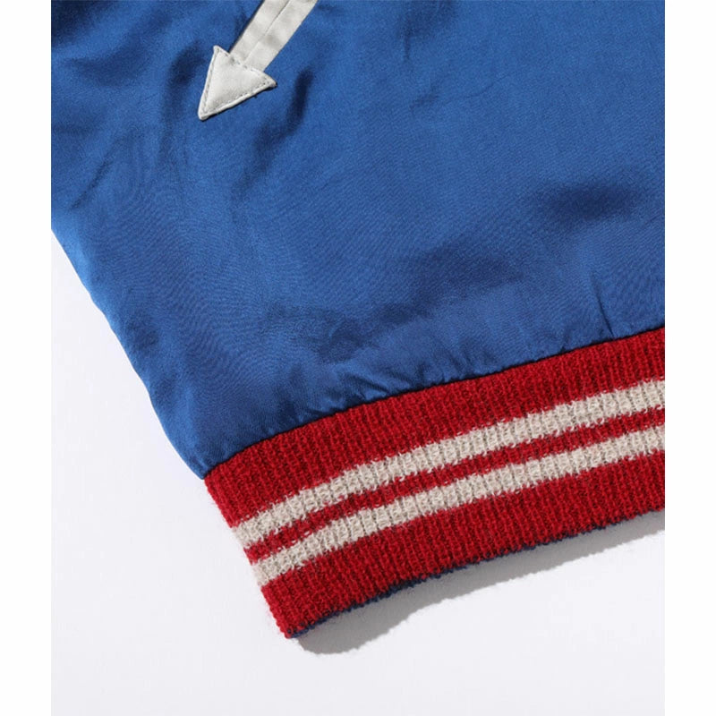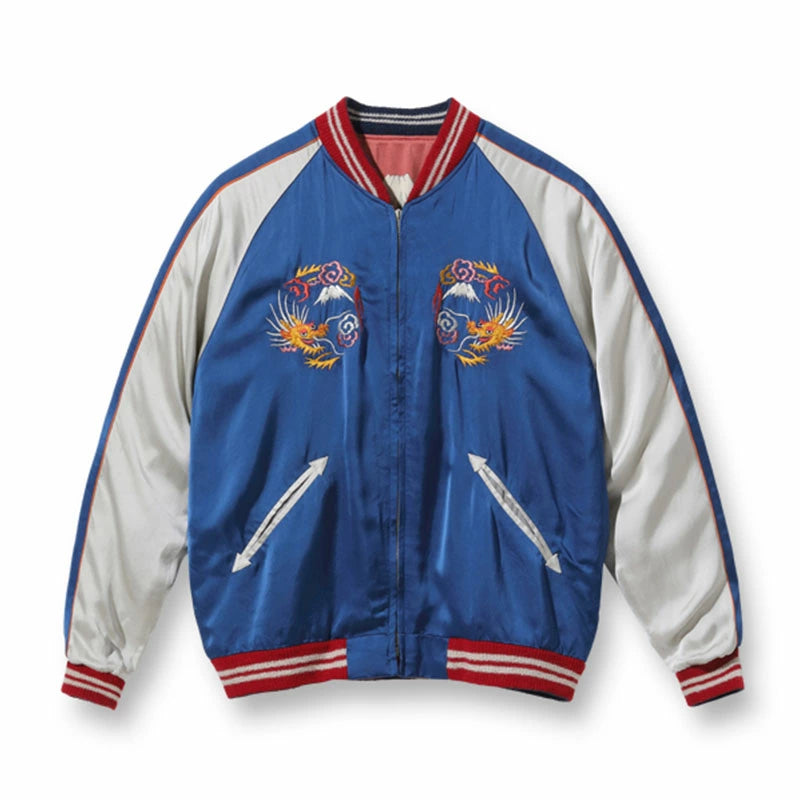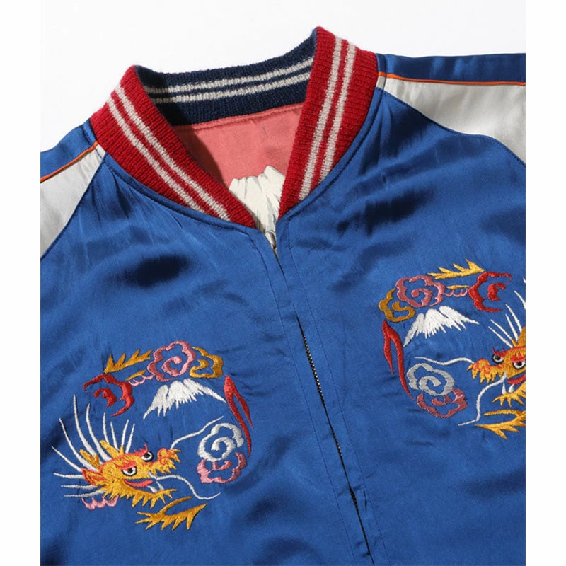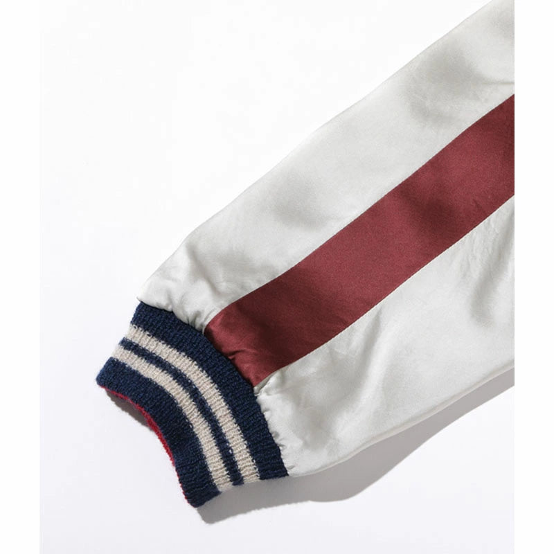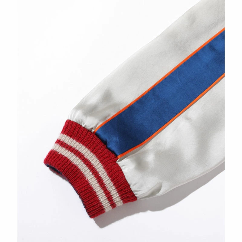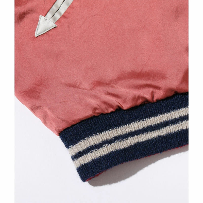 テーラー東洋のコレクションの中でも特に厳選した逸品をディテールにこだわり再現するのが、このスペシャルエディション。横振り刺繍で緻密に描かれた図案はもとより、アセテート生地の打ち込みを調整してヴィンテージと遜色なく仕上げ、ウールリブも旧式の横編み機を使用して1着ずつ編み上げている。リバーシブル仕様のファスナーについても50年以上前のファスニング機械を再稼働させ、当時と同じ手曲げのものを再現。テーラー東洋の前身である港商(こうしょう)商会のラベルを使い、ヴィンテージスカジャンの最盛期を彷彿とさせる仕上がりとなっている。