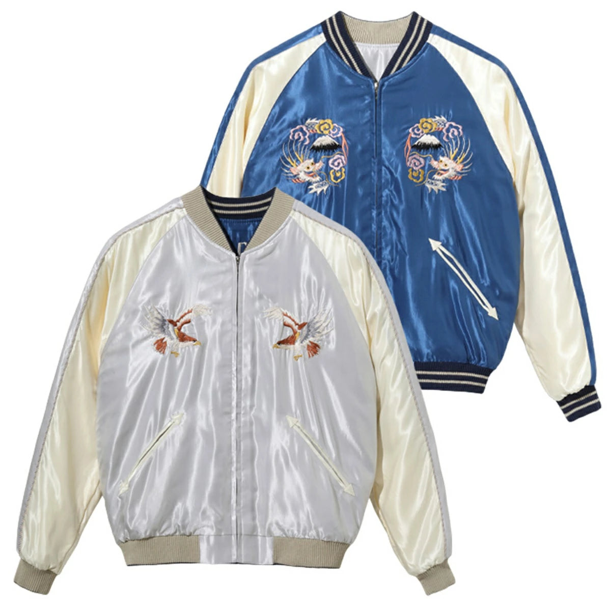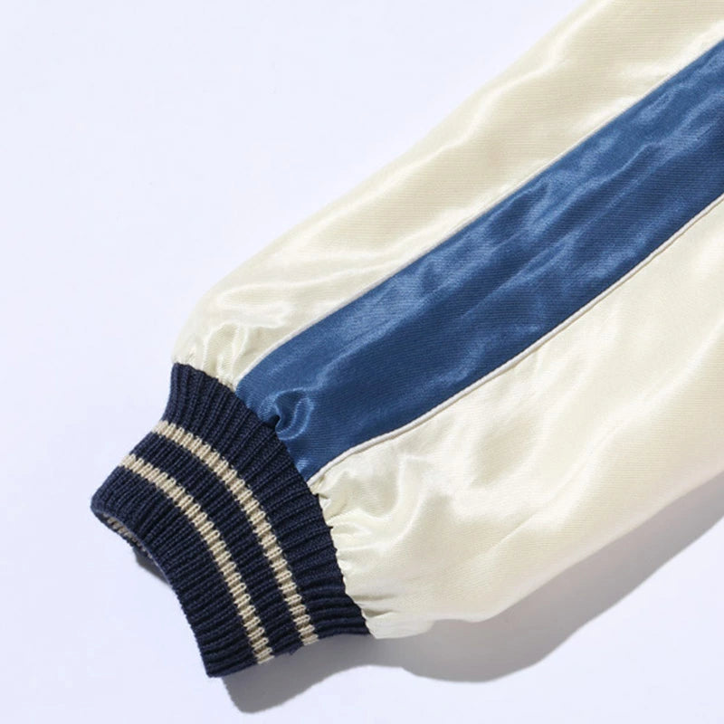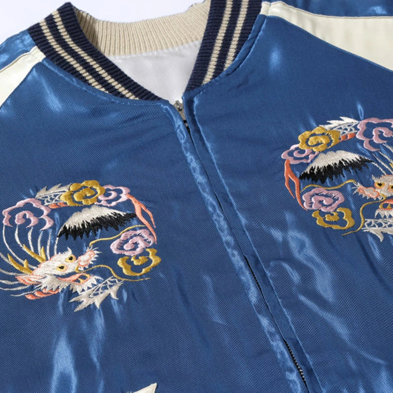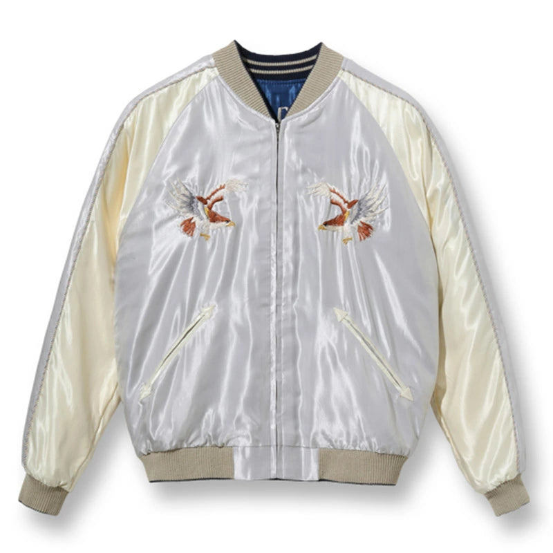 スーベニアジャケットのなかで最もスタンダードな両面にアセテート生地を使ったリバーシブルタイプ。戦後当時のスカジャンには、シルクに似た高級感を持つ物資統制外品目のアセテートが使われていた。中綿がないため季節を問わず着用でき、独特なドレープ感も魅力といえる。
