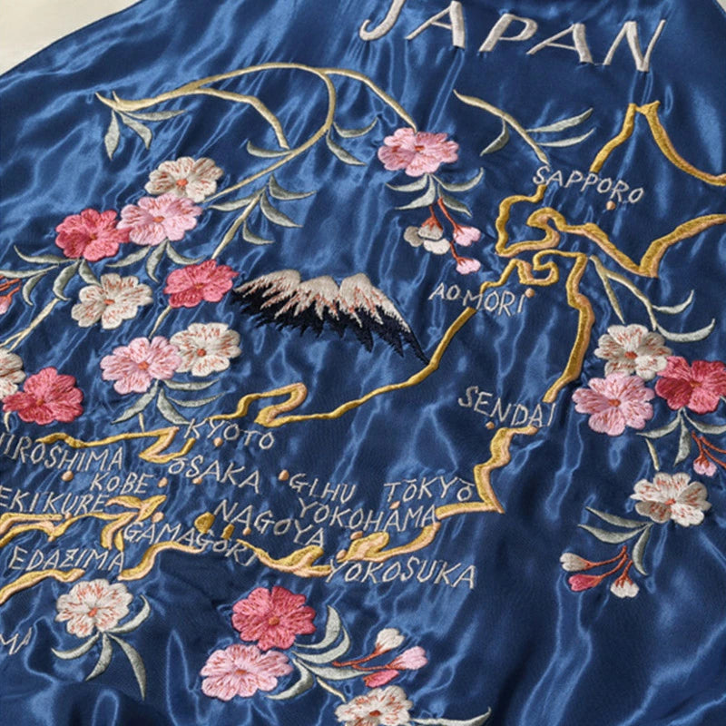リバーシブル面は枝垂れ桜(シダレザクラ)が日本地図を囲む大変珍しいジャパンマップ柄。ヴィンテージスカジャンにおいて桜と地図の組み合わせは数あれど、枝垂れ桜の刺繍は本作以外に発見されていない。記された地名が西に集中していることから、下関や呉などの米軍基地周辺で販売されていたと考えられる。