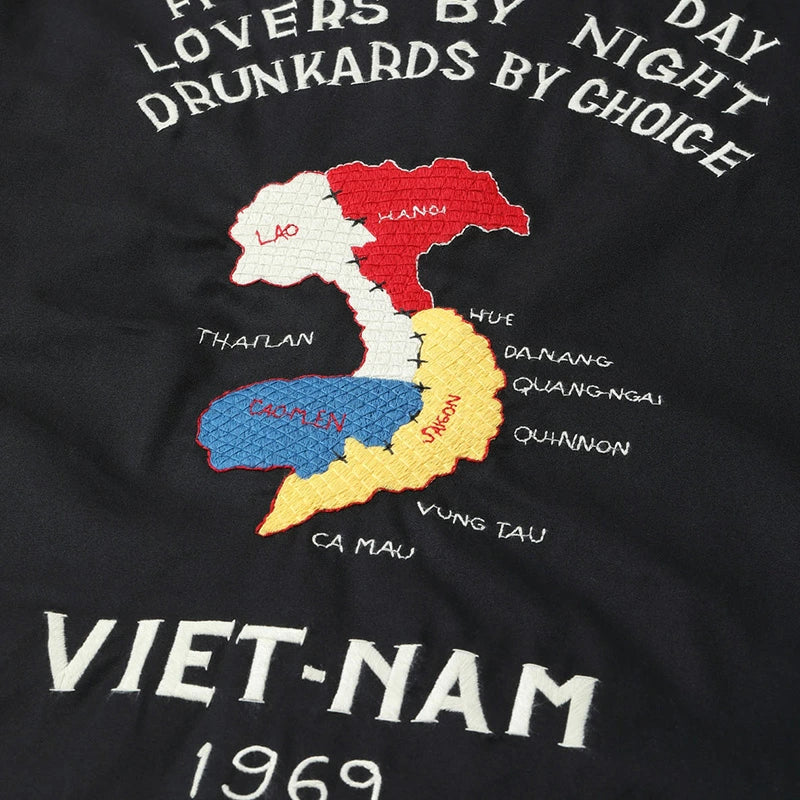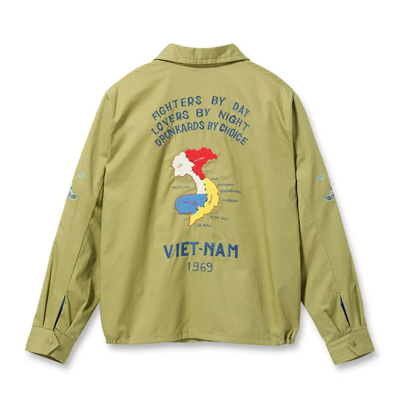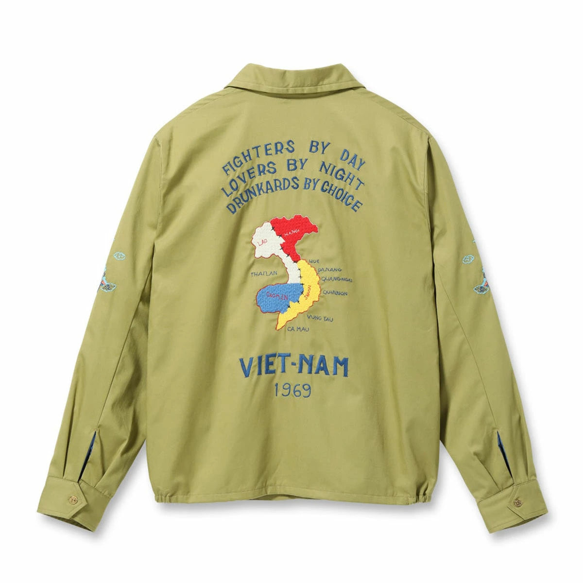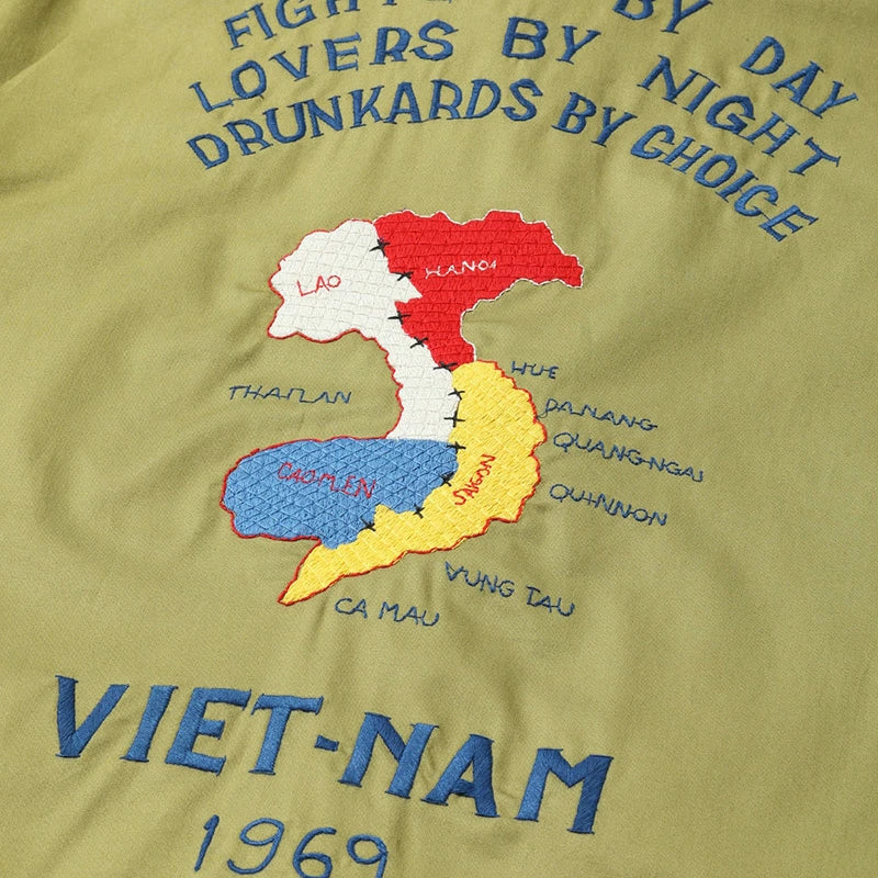 1969年にベトナムへ駐留していた米兵がカスタムオーダーで仕立て、アメリカへと持ち帰った1着を再現。ベトナムマップをメインのモチーフとした王道的なデザインだが、それぞれの刺繍には特徴がある。胸のタイガーヘッドは他と比べてシャープな図案。「福」の文字が2色の色糸で描かれているところも珍しい。背中の地図の中央にはクロスの刺繍が施されており、これも他のベトナムマップ柄には見られない仕様。背面上部のメッセージは途中で途切れているが、それもヴィンテージに基づいて再現している。ブラックに加え、ヴィンテージでもレアなグリーンとオレンジの3色展開。