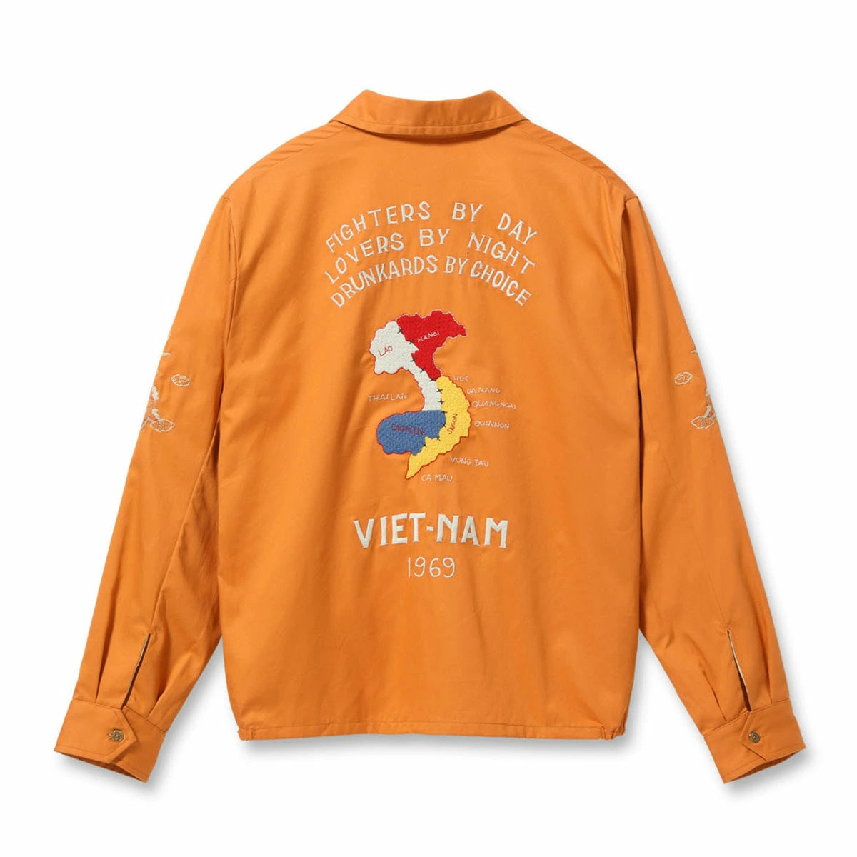 1969年にベトナムへ駐留していた米兵がカスタムオーダーで仕立て、アメリカへと持ち帰った1着を再現。ベトナムマップをメインのモチーフとした王道的なデザインだが、それぞれの刺繍には特徴がある。胸のタイガーヘッドは他と比べてシャープな図案。「福」の文字が2色の色糸で描かれているところも珍しい。背中の地図の中央にはクロスの刺繍が施されており、これも他のベトナムマップ柄には見られない仕様。背面上部のメッセージは途中で途切れているが、それもヴィンテージに基づいて再現している。ブラックに加え、ヴィンテージでもレアなグリーンとオレンジの3色展開。