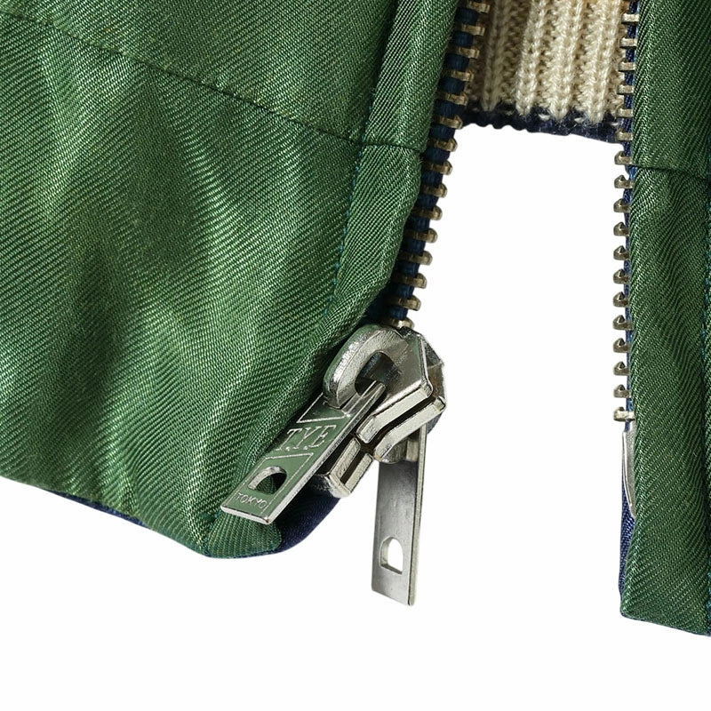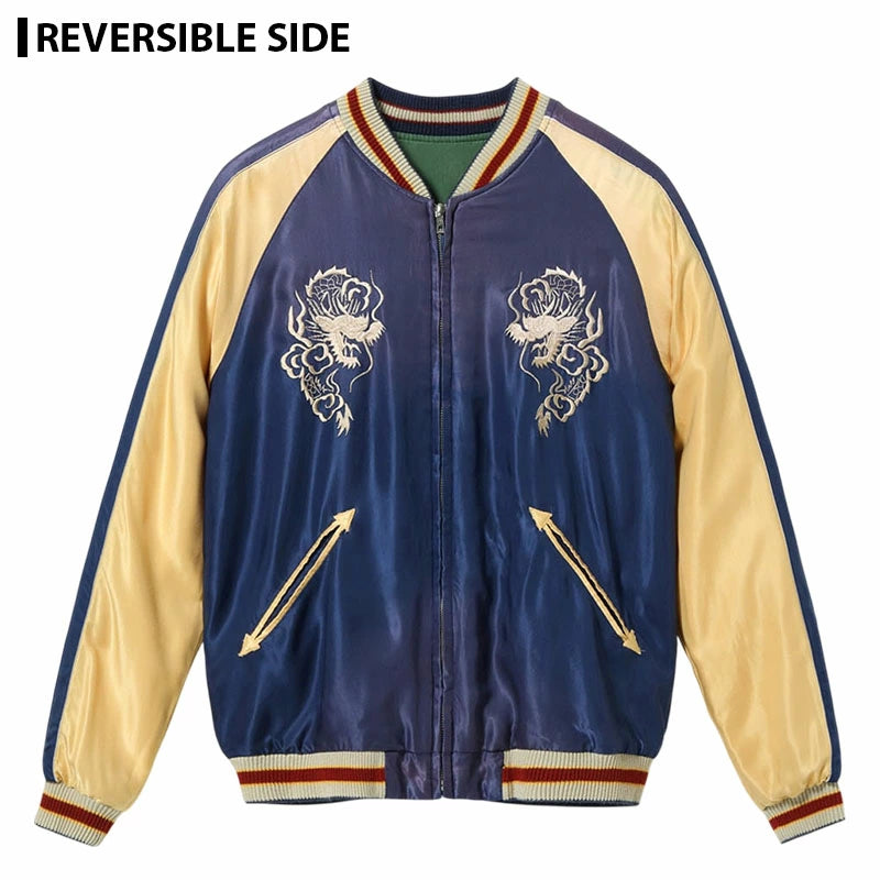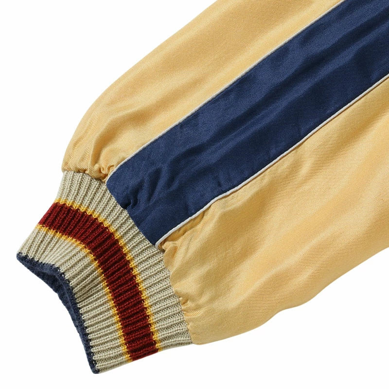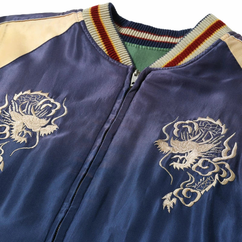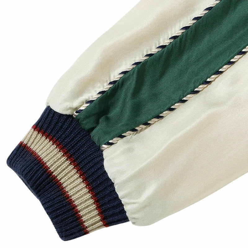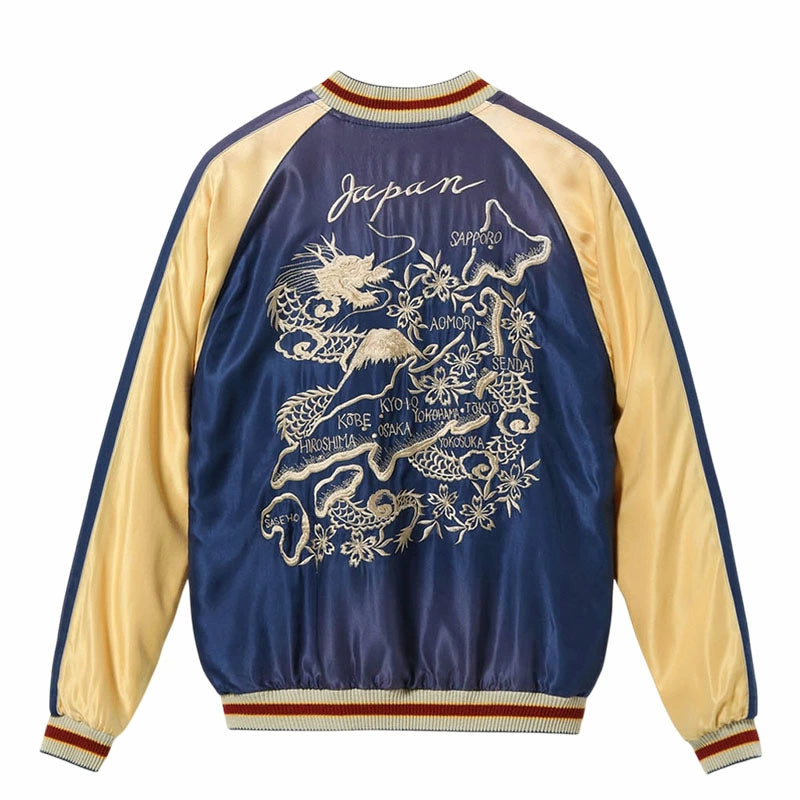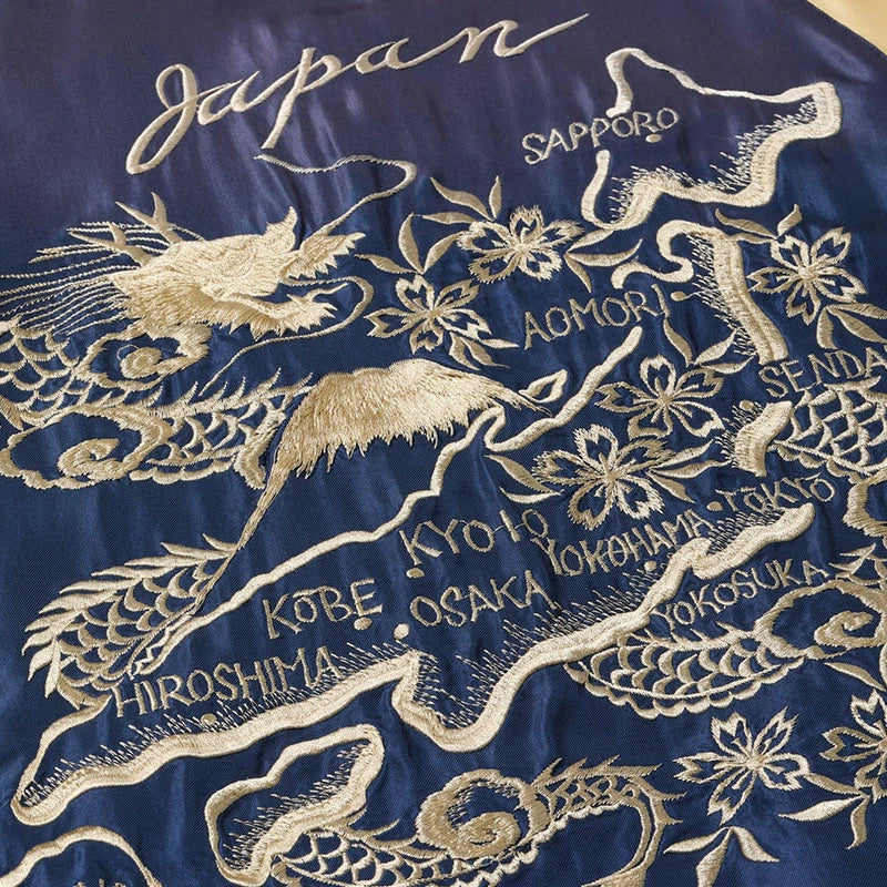 リバーシブル面はジャパンマップ柄。日本列島を守護する龍、富士山、桜の花々といった複数のモチーフで構成される豪華な絵柄だが、色糸はオフホワイト単色でレーヨン糸の光沢や立体的な刺繍の陰影を駆使し、針足のみで描き出している。褪色したネイビー×ゴールドのボディに合わせ、リブにベージュ、差し色として赤を配した統一感のある仕上がり。