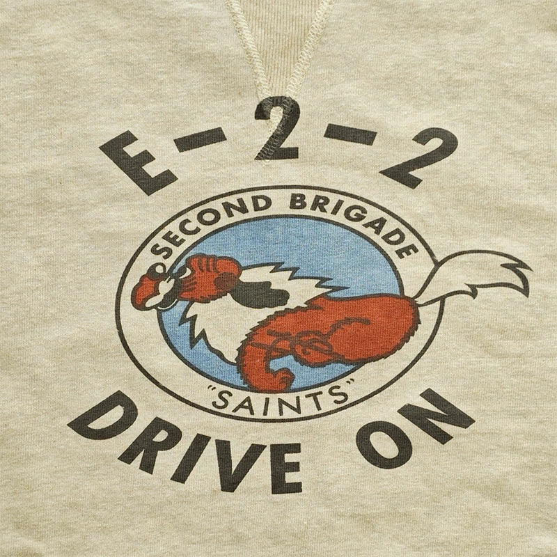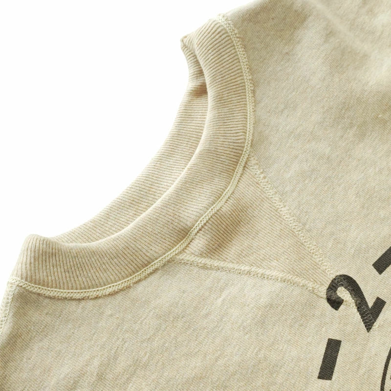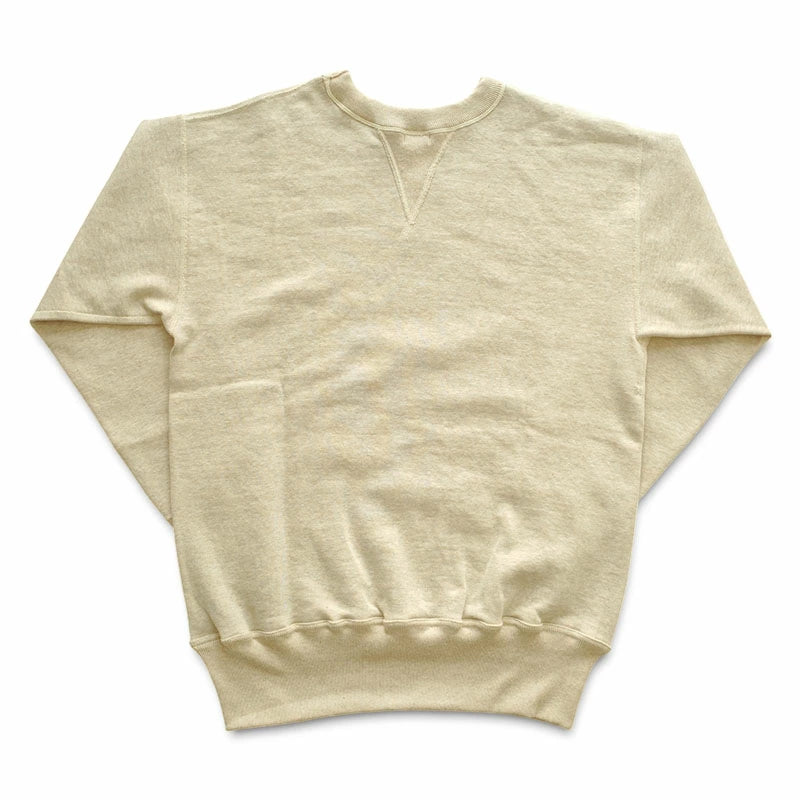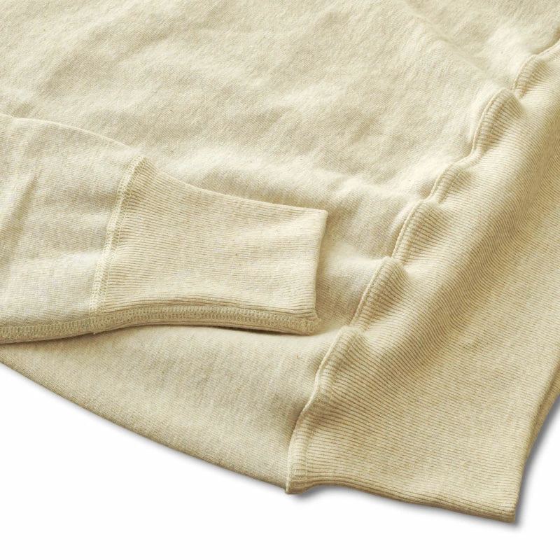 カットソーがウールからコットンに変わった1930年代からある挟み込み仕様の腰リブ。首まわりには伸縮に富むV字のフライスを前後に配した四本針仕様のスウェットです。肩口から垂直に落ちる袖口のセットインスリーブはややソリッドな印象を受けるシンプルなデザインですが、腰帯のバインダー仕様は着込むほどにアタリが生まれます。